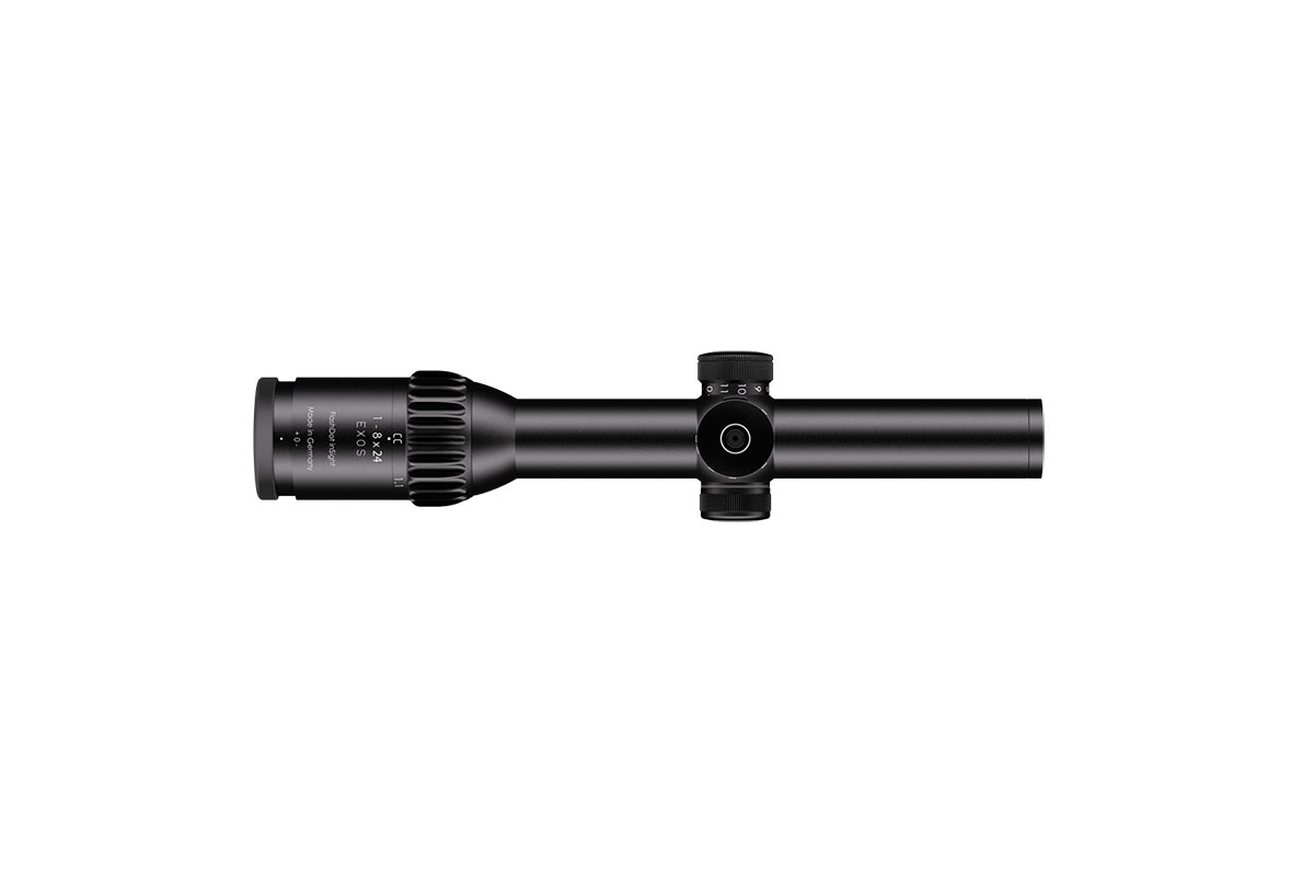 4060537066777 The 1‑8×24 Exos from Schmidt and Bender is a highly versatile, premium hunting riflescope designed for both rapid target acquisition and effective mid‑range shooting. With a magnification range of 1–8× and a 24 mm objective lens, it combines the speed of a red‑dot style sight with the precision of a full zoom optic. Key Features and Benefits True 1× magnification at the low end enables fast, intuitive shots with both eyes open and no magnification distortion. Higher magnification transitions up to 8×, offering flexibility across a wide range of distances. Wide field of view: approximately 35.3 m to 4.9 m at 100 m, providing excellent situational awareness at low magnification and fine detail at higher zoom. Generous eye relief of 90 mm for comfortable and safe mounting across different rifle platforms. High optical quality with an exit pupil of approximately 9.6–3.0 mm and light transmission over 90 %, ensuring bright, crisp imagery even in low light. Compact, durable build: 30 mm main tube, length approx. 293 mm, weight around 595 g. Adjustable illuminated reticle in certain versions for optimal visibility in varied lighting conditions. Technical Highlights Magnification: 1–8× Objective Lens Diameter: 24 mm Field of View: approx. 35.3–4.9 m @100 m Exit Pupil: approx. 9.6–3.0 mm Eye Relief: 90 mm Transmission: >90% Tube Diameter: 30 mm Length: approx. 293 mm Weight: approx. 595 g Ideal Use Case The 1‑8×24 Exos is perfect for hunters and shooters engaging fast-moving game or participating in driven hunts where immediate reaction is needed at short distance, while still providing enough zoom to clearly identify and shoot at greater ranges. Its blend of speed, clarity, and field-ready design makes it a versatile, one-scope solution.