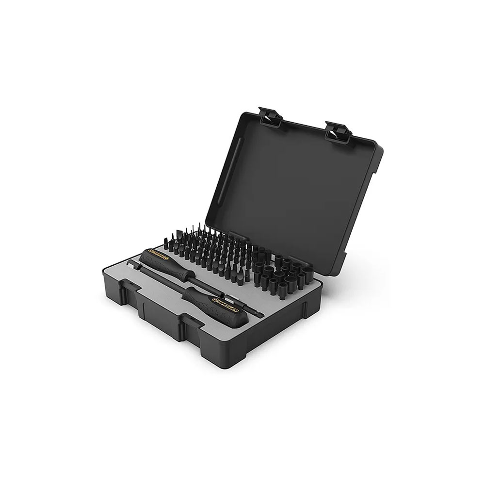 Die kurzen und verlängerten Griffstücke ermöglichen eine Vielzahl von Anwendungen, während die texturierten Gummi-Griffe für einen komfortablen und sicheren Halt sorgen. Das gesamte Set ist in einem maßgefertigten Koffer organisiert, sodass du den perfekten Bit immer schnell finden kannst.