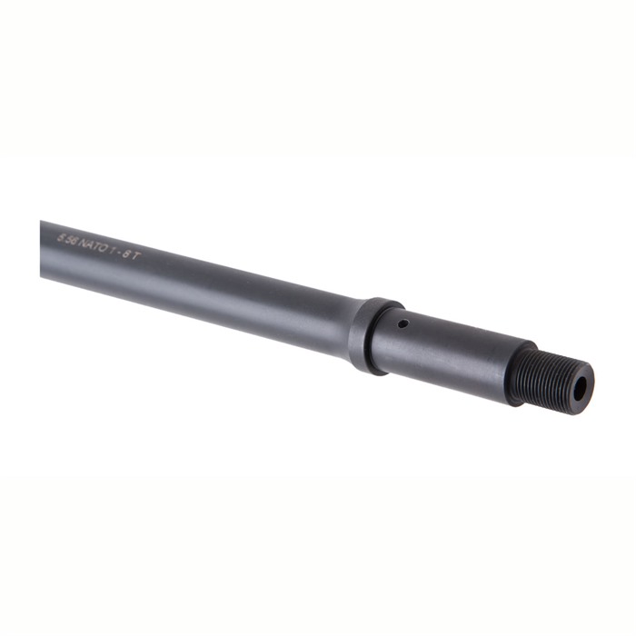 Hinter dem Gasblock hat der Lauf ein Government-Profil, das zu einer Schulter und einem 1.1" Journal von .625 Gasblock verjüngt. Vor dem Gasblock verläuft der Lauf gerade zu einem 1/2x28 Mündungsgewinde mit voller Schulter.