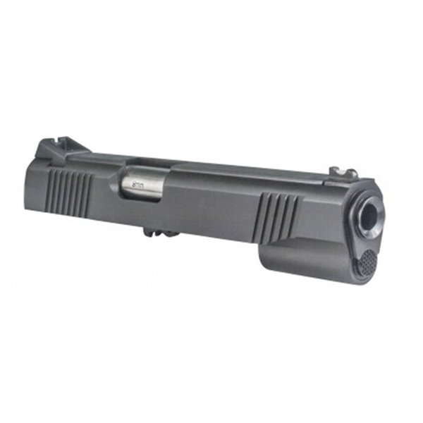 1911 Slide / Top End Assembly. Fusion Diamond Series, Action shooting slide set-up, 5-inch standard Government size, 1911 Colt style, Slide/top-end chambered in 9mm, completely assembled with recoil system and tested. Features high-rib flat top, thick combat style front and rear serrations and standard dovetail black target rear sight with white fiber optic front sight. Diamond Series slides are precision CNC machined from solid 4140 Bar-stock and all heat-treatments completed. These top ends are completely assembled and finished, they have also been test-fired on a slave frame for function. The assembly comes complete with; Slide, barrel, barrel bushing, link, link pin, extractor, firing pin, firing pin spring, stop plate, recoil system and sights. All completely installed, tested and black oxide finished. The firing pin holes on all diamond series slides and top ends are reamed to take the 9mm /38 Super firing pin as with all high grade slides. Standard dovetail Rear: .495 x 65 degree, Front: .330 x 65 degree sight cuts. These top-ends are ready to be assembled to any 1911 Government Frame.