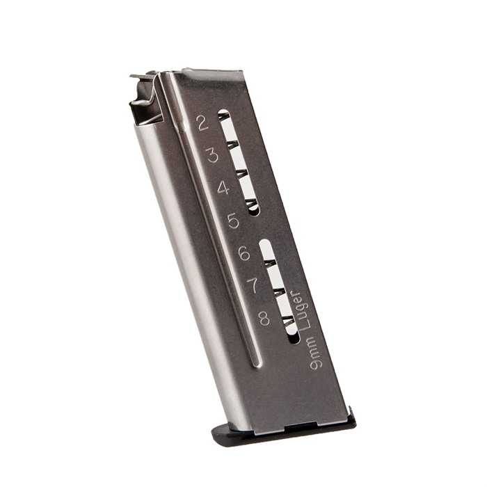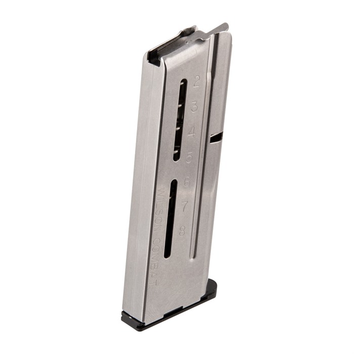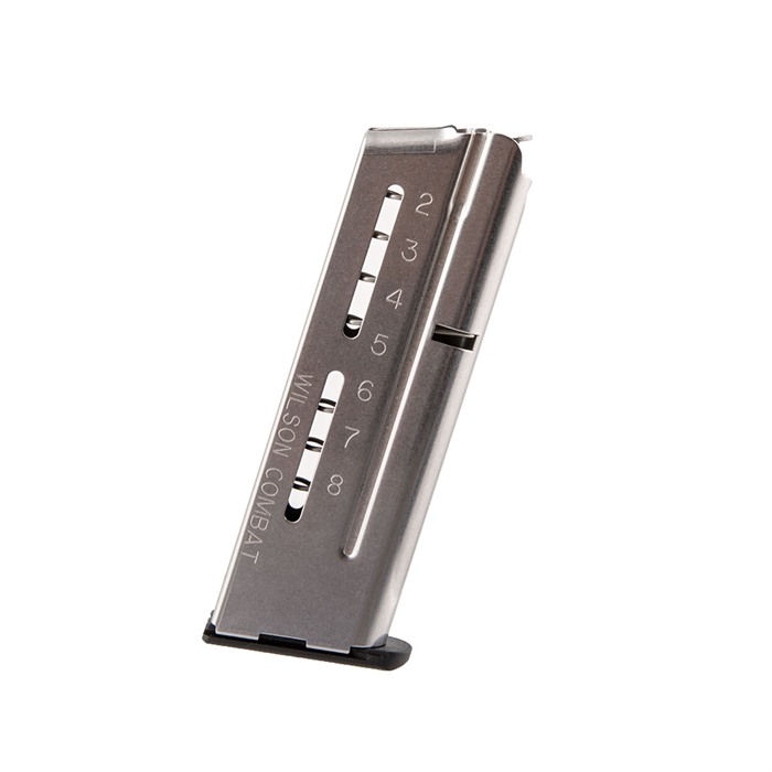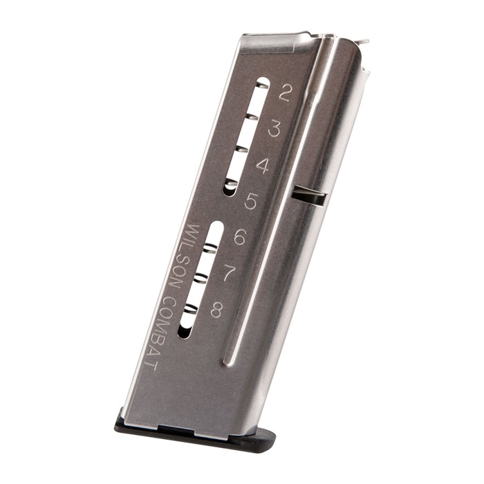 Ultra-Reliable, Extra-Capacity & Smooth Feeding Of All The Rounds - Wilson Combat applied 30 years of experience building high-performance 1911 magazines to develop this ultra-reliable magazine for combat, competition, or self-defense. Made with state-of-the-art materials using the latest manufacturing technology, these single-stack magazines are built tough to keep running in unforgiving, real-world conditions. The body formed from extra-thick stainless steel, with the radius of each curve engineered to minimize stress points, virtually eliminates feed lip cracking and stress fatigue. Even the position of the witness slots toward the rear is designed to enhance structural integrity. A proprietary welding, deburring, and polishing process provides an unusually strong, super-smooth seam to ensure snag-free follower movement and easy insertion in the mag well. The non-tilt follower of self-lubricating polymer fully supports the ammo stack to prevent nose-dives, double feeds, and other hang-ups. The mag body design puts less tension on the spring than standard magazines, increasing spring life and making it easy to seat a fully loaded magazine with the slide closed. Numbers 1 through 10 stamped on the bottom help you mark each of your magazines to track usage and performance.
