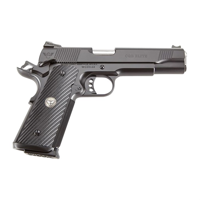 CQB 1911 ELITE FULL SIZE 45 ACP SEMI-AUTO HANDGUN The Close Quarters Battle Elite blows the competition away with a standard package of custom features designed to meet the needs of tactical shooting professionals, each selected with the input of experts in the field. Here’s what is standard: Bullet Proof® parts throughout, serrations on the top and the rear of the slide, Battlesight rear sight with fiber optic front sight, matching serrations on the back of the extractor, checkered mainspring housing and front strap for a sure grip, and standard G10 grips with a tapered cut-out for easy access to the semi-extended magazine release button. If your requirements are for a combat pistol, a must-work-every-time firearm, custom built to your specifications, put a Wilson Combat® CQB Elite On Your Side® today. FEATURES: Full-Size Carbon Steel frame High-Cut checkered frontstrap High-Ride Bullet Proof® beavertail grip safety Bullet Proof® Tactical thumb safety 3 ½# – 4 ½# crisp trigger pull Bullet Proof® magazine well Bullet Proof® magazine release G10 Diagonal flat-bottom grips 5" Carbon Steel slide Battlesight with fiber optic front sight 5" Stainless Match-Grade barrel & bushing, hand fit 30 LPI slide top serrations 40 LPI serrated rear of slide Front cocking serrations SPECIFICATIONS: Cartridge: 45 ACP Magazine capacity: 8 rounds Barrel length: 5" Overall length: 8.7" Sight radius: 6.6" Height: 5.6" Width: 1.3" Weight empty: 41 oz Weight loaded: 46.6 oz