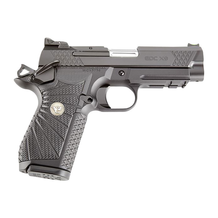 Wilson Combat has redefined the defensive handgun with the EDC X9, a modern hybrid of our EDC 9 1911 slide assembly mated with the all new high-capacity X-frame. This groundbreaking design combines the accuracy, ergonomics and trigger pull of the classic 1911 design with enhanced reliability, and concealable, high capacity performance. The ergonomic design of the X-frame in conjunction with your choice of small or large back strap and small, medium or long trigger pad can be tailored to fit all hand sizes comfortably. The EDC X9 front and back strap are machined with the Wilson Combat X-Tac tread pattern that provides a tactile but nonabrasive grip in all shooting conditions. The EDC X9 will fit the majority of holsters on the market designed for 4” or 4.25” 1911 pistols and is offered with or without an accessory rail. The EDC X9 comes with many options to help fit the gun to your needs and preferences. Please refer to our FAQ Section to learn more about the parts we’ve used, maintaining your gun, and other questions you might have.Designed by Bill Wilson and Wilson Combat engineers, the X-frame is a 15-round, high capacity 9mm 1911 frame that is similar in size to a traditional compact, single stack 1911. The X-frame is machined at Wilson Combat from T6-7075 aluminum and accepts a high capacity magazine with a grip that is smaller in circumference than a standard 1911 while retaining traditional 1911 controls. The EDC X9 15-round, double column magazine was developed jointly with Mec-Gar, industry leaders in double column magazine design. The screwless X-frame design uses hammer spring tension to keep the aggressive traction Wilson/VZ G-10 starburst pattern grips securely in place. The result is a highly concealable, high capacity pistol frame that easily disassembles for grip/back strap removal or routine cleaning with a ?” pin punch. “The EDC X9 has been the most extensive design and development project Wilson Combat has undertaken in our 40-year history and it reflects what the company has become today from our humble beginnings as a one man gunsmithing shop.”-Bill Wilson, CEO of Wilson Combat.The EDC X9 slide assembly is from our single stack EDC 9 pistol with Wilson Combat’s ERS “Enhanced Reliability System” for 9mm 1911’s. The ERS is tailored to the varying power level of 9mm ammunition and maintains impressive reliability in all conditions, even when heavily fouled and low on lubrication. Other features include a Tri-Top slide profile with user-replaceable front sight, single lug tapered cone match-grade 1911 barrel, rear Tactical Adjustable Battlesight and a rugged, user-serviceable external extractor. “During my extensive shooting of the EDC X9 during development and final testing I have been very impressed with its functional reliability beginning all the way back to some of the early prototypes, this tells me the overall design is inherently very sound and I applaud our engineers and pistol smiths that worked so hard on this project.”-Bill Wilson, CEO of Wilson Combat. SPECIFICATIONS: High-Capacity Compact Size Aluminum Lightrail X-Frame with Reliability Enhanced Frame Rails Unique X-TAC Frontstrap/Mainspring Housing Treatment Concealment Bullet Proof® Hammer Bullet Proof® Ambidextrous Thumb Safety 3 ½# – 4 ½# Crisp Trigger Pull with Medium Length Pad Bullet Proof® Magazine Release Black G10 Aggressive Starburst Grips with Pewter Medallions 4” Stainless Steel Tri-Top Slide with External Extractor Unique X-TAC Rear & Front Cocking Serration Treatment on Slide Heavy Machine Chamfer on Bottom of Slide Elevation Adjustable Tactical Battlesight with Fiber Optic Front Sight with 4-40 Hex Head cap Screw 4” Stainless Cone Barrel with Reliability Enhancing Lock-up, Flush Cut Reverse Crown Fluted Chamber Fluted Barrel 30 LPI Slide Top Serrations 40 LPI Serrated Rear of Slide Carry Cuts/Ball Endmill Cuts 2 15-Round Capacity Magazines