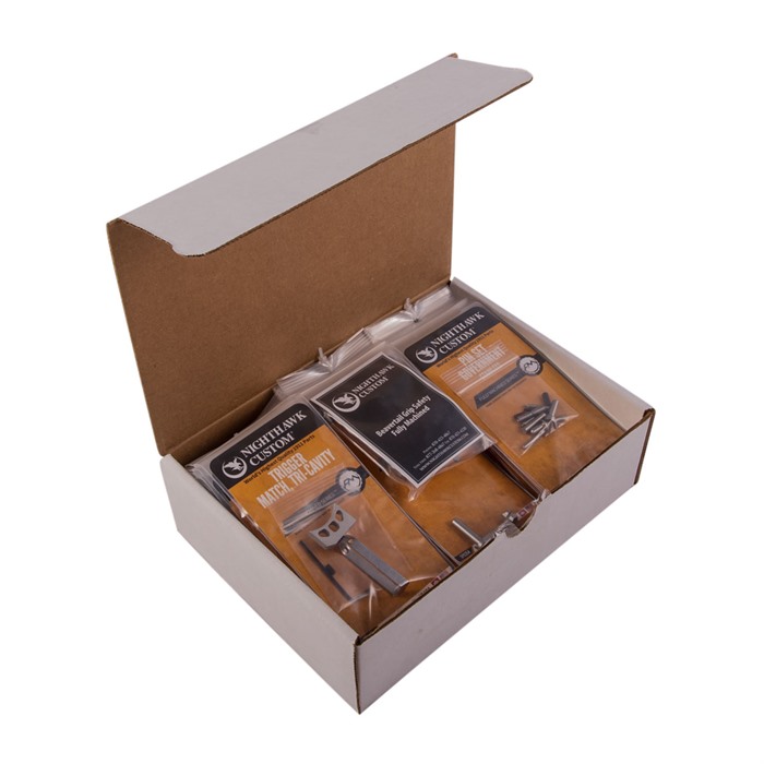 Nighthawk’s Match Grade 1911 Parts Kit contains everything you need to assemble a custom Government model pistol. Just add the full-size frame of your choice - with the features you want - and you are ready to build your own Dream Gun™. Not just a "small parts kit, the Nighthawk Match Grade 1911 Parts Kit is a grown-up variation of the model kits you built as a kid - only this one does require some gunsmithing skills. Except for the sights, ALL components in the Nighthawk Match Grade 1911 Parts Kit are machined from high-grade stainless steel, left "in-the-white" with a fine matte finish. The steel sights are blued to prevent glare from spoiling your sight picture, and the front sight comes with a red fiber optic insert for enhanced visibility. The slide has forward-angled, wide-groove, front and rear serrations. Recoil springs are painted for weight identification. Corrosion resistant stainless steel Fully machined components for precise fit & finish Novak front & rear sight dovetails pre-machined into slide top .250" radius on grip safety Extensive gunsmithing is required Separate kits to build a standard .45 ACP pistol or 9mm Luger chambered 1911 The Nighthawk Match Grade 1911 Parts Kit requires no FFL for purchase, since it does not contain the receiver (FFL item), so it can be shipped directly to your shop or home.