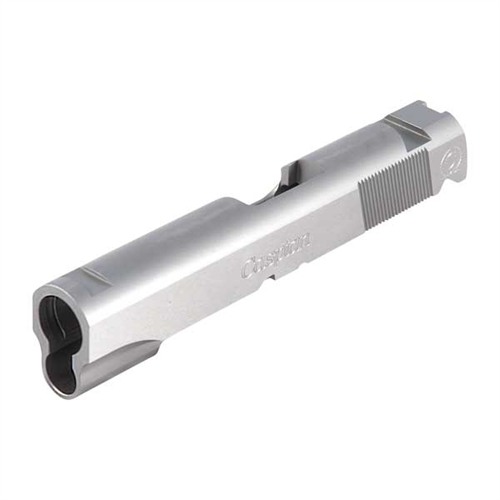 SPECS: 4340 carbon steel, in-the-white, or 416 stainless steel, natural finish. Government model accepts 5" barrel. Commander accepts 4.25" barrel. Officers model accepts 3.5" barrel. All Caspian slides require the use of a 9mm/.38 Super firing pin.