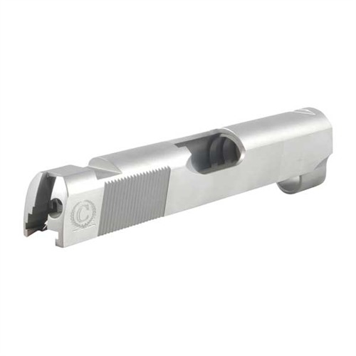 Custom-quality slides from Caspian, ready to be fitted to the frame of your choice. They start as high-quality forgings for extra strength, then are heat-treated to Rc 38-41 before machining for exceptional dimensional stability. Sides are polished, while the rest of the surface is bead-blasted for a non-glare, matte finish. Deep-cut, forward-angled rear cocking serrations prevent slippage when racking, even with a wet hand. Available in 4340 carbon steel (CS) and 416 stainless steel (SS) with .45 ACP, .40 S&W, and 9mm breechfaces. Commander and Officers models in .45 ACP only. Choose a slide without sight cuts (NC), or between two pre-cut dovetail options: a Novak Lo-Mount or Bo-Mar BMCS rear cut, both coupled with a Novak front cut. Recon slide is a Government slide with ball cuts at the front that line up with the light rail on the Caspian Recon frame (available separately). All slides require the use of a 9mm/.38 Super firing pin.