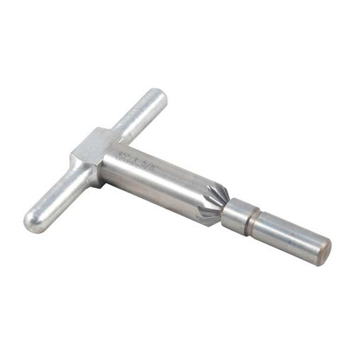 Der 45° Chamfering Cutter bricht die Kanten der Züge für einen sauberen Geschossausgang oder entgratet die Kammeröffnungen des Revolverzylinders für schnelles Nachladen. Das Set beinhaltet den Cutter, einen Griff und einen Pilot, alles verpackt in einer Polypropylenbox. Der austauschbare Pilot sorgt dafür, dass der Cutter korrekt ausgerichtet bleibt. Kaufe zusätzliche Piloten, um einen Cutter für viele verschiedene Kaliber zu verwenden. Piloten für andere Kaliber sind separat erhältlich. Der 45° Cutter, der in den mit * gekennzeichneten Sets geliefert wird, hat einen Durchmesser von 5/8", um die größeren Mündungen von Läufen und Zylindern in diesen Kalibern korrekt zu entgraten. Alle anderen Sets haben einen Durchmesser von ½".