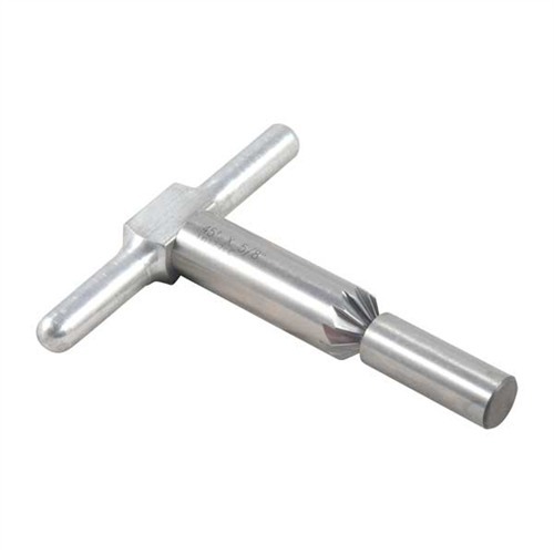 Der 45° Chamfering Cutter bricht die Kanten der Züge für einen sauberen Geschossausgang oder fasst die Mündungen der Revolverzylinder für schnelles Nachladen an. Im Lieferumfang enthalten sind der Cutter, ein Griff und ein Pilot, alles in einer Polypropylen-Box. Der austauschbare Pilot sorgt dafür, dass der Cutter richtig ausgerichtet bleibt. Kaufe zusätzliche Piloten, um einen Cutter für viele verschiedene Kaliber zu verwenden. Piloten für andere Kaliber sind separat erhältlich. Der 45° Cutter, der in Sets mit einem * geliefert wird, hat einen Durchmesser von 5/8", um die größeren Mündungen von Läufen und Zylindern bei diesen Kalibern korrekt zu fasen. Alle anderen Sets haben einen Durchmesser von ½".