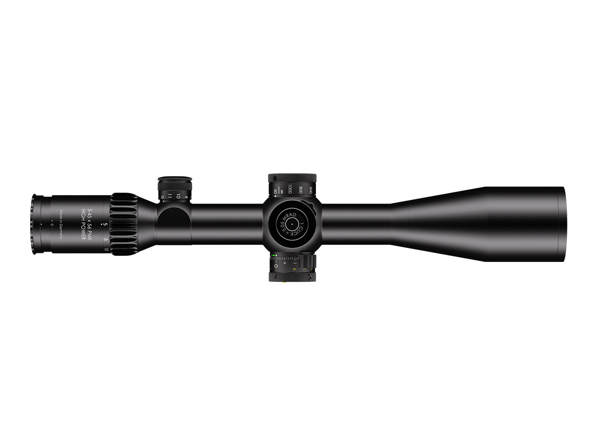 4060537027471 The 5–45×56 PM II High Power is a professional‑grade precision optic that merges a high‑performance riflescope with spotting‑scope capability. Designed for observation and ultra‑long‑range engagement, its enormous 9× zoom range (5–45×) makes it equally at home on reconnaissance, match, or tactical platforms where both identification and shot‑making accuracy are required. Engineered for extreme clarity and reach, the 56 mm objective delivers excellent light gathering while the optical system maintains a large usable field of view across the entire zoom range — allowing fast situational awareness at low magnification and razor‑sharp detail at high power. The reticle sits in the first focal plane, so hold‑offs and subtensions remain precise at any magnification. The model features robust, lockable turrets with fine 0.1 mrad click values and very large usable internal adjustment ranges tailored for extreme‑range correction. Built on a rugged 34 mm main tube, the High Power is constructed for demanding environments: it is fully weatherproof, fogproof and shock‑resistant. Despite its long reach, the design balances mechanical strength with practical ergonomics for field use. Standout Features Exceptional 5–45× magnification range for combined observation and precision shooting Large 56 mm objective for outstanding light transmission and image resolution First focal plane reticle for accurate ranging and holdover at any magnification Precision turrets with 0.1 mrad click value and extensive elevation/windage adjustment range Side/parallax adjustment for crisp focus from mid‑range to extreme distances High optical transmission (~90%) and illuminated reticle options for low‑light operations Robust 34 mm tube, weatherproof and built for professional use Key Specifications Magnification: 5–45× Objective diameter: 56 mm Main tube diameter: 34 mm Field of view: approx. 7.8–0.9 m @ 100 m Exit pupil: approx. 8.8–1.2 mm Eye relief: 90 mm Length: approx. 434 mm Weight: approx. 1,130 g Reticle: FFP (various tactical reticle options) Click value: 0.1 mrad Elevation adjustment range: ~27 mrad (internal ~29.6 mrad) Windage adjustment range: ±6 mrad (internal ~21.1 mrad) Parallax: adjustable Illumination levels: multiple (illuminated reticle available) Optical transmission: ~90% Designed and manufactured to professional standards, the 5–45×56 PM II High Power is the go‑to optic for operators and precision shooters who require unmatched versatility, extreme reach and uncompromising optical and mechanical performance.