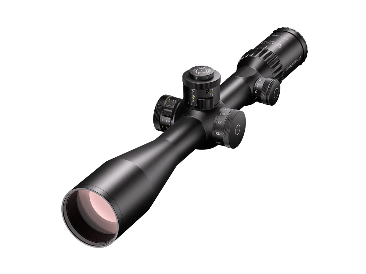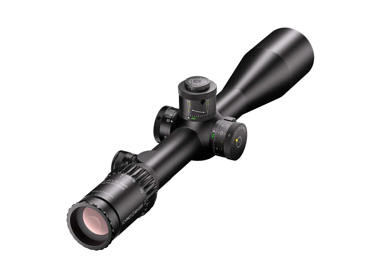 4060537027532 The 5–45×56 PM II High Power is a professional‑grade precision optic that merges a high‑performance riflescope with spotting‑scope capability. Designed for observation and ultra‑long‑range engagement, its enormous 9× zoom range (5–45×) makes it equally at home on reconnaissance, match, or tactical platforms where both identification and shot‑making accuracy are required. Engineered for extreme clarity and reach, the 56 mm objective delivers excellent light gathering while the optical system maintains a large usable field of view across the entire zoom range — allowing fast situational awareness at low magnification and razor‑sharp detail at high power. The reticle sits in the first focal plane, so hold‑offs and subtensions remain precise at any magnification. The model features robust, lockable turrets with fine 0.1 mrad click values and very large usable internal adjustment ranges tailored for extreme‑range correction. Built on a rugged 34 mm main tube, the High Power is constructed for demanding environments: it is fully weatherproof, fogproof and shock‑resistant. Despite its long reach, the design balances mechanical strength with practical ergonomics for field use. Standout Features Exceptional 5–45× magnification range for combined observation and precision shooting Large 56 mm objective for outstanding light transmission and image resolution First focal plane reticle for accurate ranging and holdover at any magnification Precision turrets with 0.1 mrad click value and extensive elevation/windage adjustment range Side/parallax adjustment for crisp focus from mid‑range to extreme distances High optical transmission (~90%) and illuminated reticle options for low‑light operations Robust 34 mm tube, weatherproof and built for professional use Key Specifications Magnification: 5–45× Objective diameter: 56 mm Main tube diameter: 34 mm Field of view: approx. 7.8–0.9 m @ 100 m Exit pupil: approx. 8.8–1.2 mm Eye relief: 90 mm Length: approx. 434 mm Weight: approx. 1,130 g Reticle: FFP (various tactical reticle options) Click value: 0.1 mrad Elevation adjustment range: ~27 mrad (internal ~29.6 mrad) Windage adjustment range: ±6 mrad (internal ~21.1 mrad) Parallax: adjustable Illumination levels: multiple (illuminated reticle available) Optical transmission: ~90% Designed and manufactured to professional standards, the 5–45×56 PM II High Power is the go‑to optic for operators and precision shooters who require unmatched versatility, extreme reach and uncompromising optical and mechanical performance.