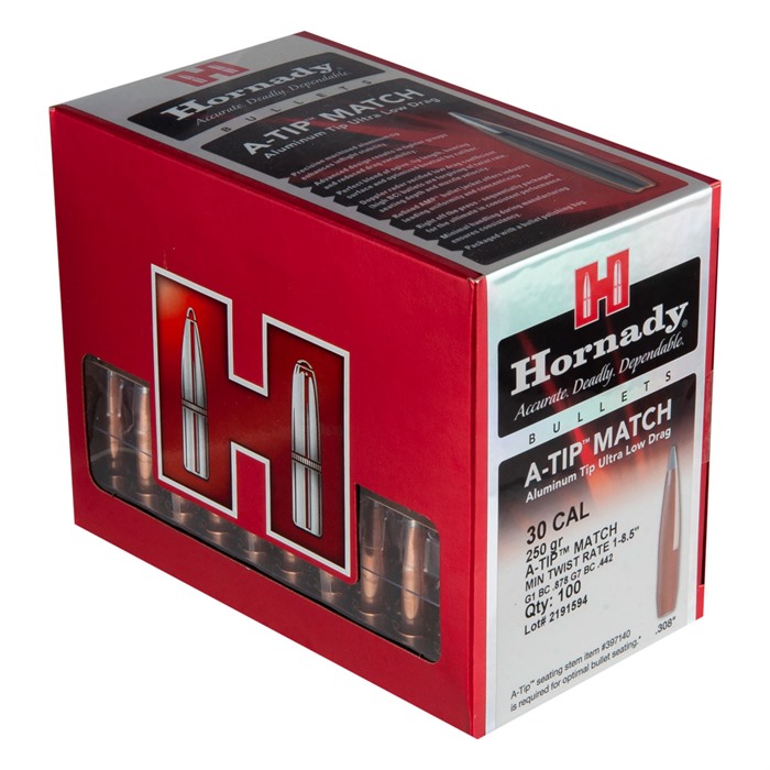 Years of research and testing by the Hornady® Ballistic Development quality control measures have led to the creation of the ultimate low drag, high performance match bullet. Aluminum tip is precision machined and longer than polymer tips which moves the center of gravity and enhances inflight stability. Aeroballistically advanced tip design results in tighter groups and reduced drag variability. Perfect blend of ogive, tip length, bearing surface and optimized boattail by caliber. Doppler radar verified low drag coefficient (high BC) bullets are forgiving of twist rate, seating depth and muzzle velocity. Refined design of the AMP® bullet jacket offers superior concentricity. Right off the press – sequentially packaged, one after another for the ultimate in consistent performance (100 clones in every box). Minimal handling throughout the manufacturing process ensures consistency from bullet to bullet. Packaged with a polishing bag to prepare bullets for loading.