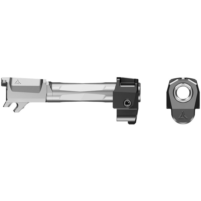 The Radian® AFTERBURNER™ + RAMJET™ combo provide unprecedented recoil reduction and match grade accuracy in a concealed carry package. The threadless barrel design allows for effortless install/removal for cleaning, while LEGAL FOR SALE IN ALL 50 STATES*. The AFTERBURNER™ compensator is machined from hardened stainless steel and the RAMJETTM barrel from hardened 416R SS; both are enhanced with a Radianite Black coating. This combination achieves low friction, high hardness, and high corrosion resistance, making overall durability and erosion from muzzle blast a non-issue. Angled front faces on the AFTERBURNER™ aid in holstering. The INTRA-LOK® mounting system uses the taper lock principle; a tapered locking screw interfaces with an angled V-groove on the underside of the barrel. This perfectly times the compensator as it locks down onto the upper barrel profile on the muzzle end of the barrel. INTRA-LOK® allows the user to simply slide the compensator over the barrel, insert and tighten the locking screw, making for a simple and repeatable installation process. This system allows the user to easily remove the barrel from the slide for cleaning. FEATURES AFTERBURNER™ Hardened SS RAMJET™ Hardened 416R SS atch Grade Barrel Gas Sealing Chamber Loaded Chamber Indicator
