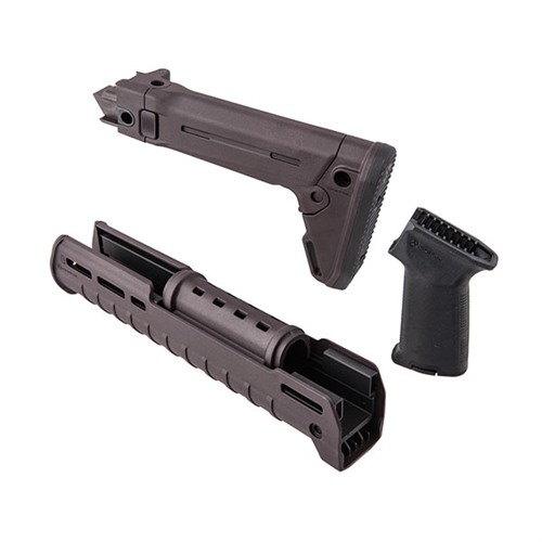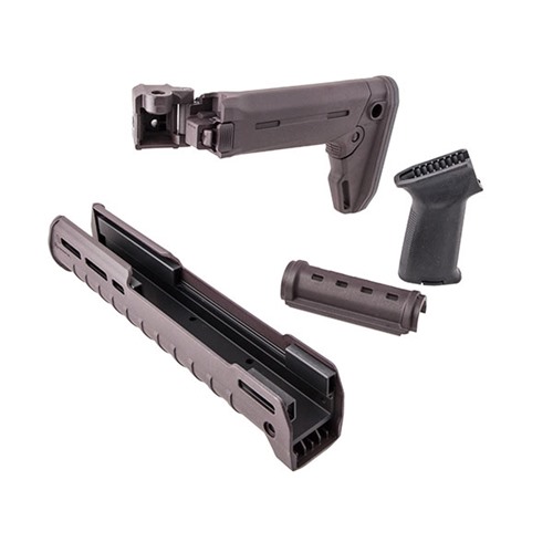 Update your Kalashnikov with these Magpul kits that feature the AK-47/74 Zhukov stock and handguard along with the Magpul MOE AK+ grip. The Magpul Zhukov-S Stock is a no-compromise folding stock for the modern AK. The Zhukov-S Stock casts aside traditional AK stock shortcomings and offers a folding, collapsible stock with QD sling mounts, modular Cheek Risers (sold separately), and a shock-absorbing rubber butt-pad for superior traction. The Zhukov has right-side folding for compatibility with side-mounted optics. Designed to fit most common stamped AK receivers without modification via a unique wedge block, the durable injection molded polymer Zhukov-S Stock redefines the human interface with the AK platform. The Magpul Zhukov Hand Guard is a fully-featured AK forearm for the modern AK. The Zhukov Hand Guard casts aside traditional AK forearm shortcomings and offers an extended option for modern shooting techniques, an aluminum chassis for strength and heat dispersion, a comfortable injection molded exterior for superior ergonomics, and M-LOK slots for optimized accessory attachment. Compatible with the Ultimak gas tube rail for optics mounting, the Zhukov Hand Guard redefines functionality for the modern AK platform. Installation requires removal of the hand guard retainer. A drop-in upgrade for AK-pattern pistol grips, the MOE AK+ is compatible with reinforced and unreinforced receivers. Designed to improve ergonomics and weapon control, the MOE borrows the rubber-overmolded surface of the popular MOE+ AR-15/M4 grip to ensure a positive and comfortable hold on the weapon. It is compatible with Magpul Grip Cores for storage customization. Please note that the Plum kit includes a black version of the MOE AK+ grip.