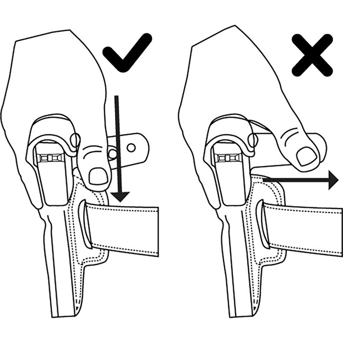 - Um zu ziehen, greife das Holster mit einer Hand und benutze die andere Hand, um den Sicherungsriemen zu lösen.