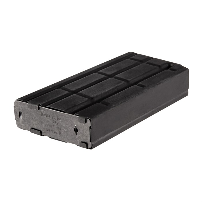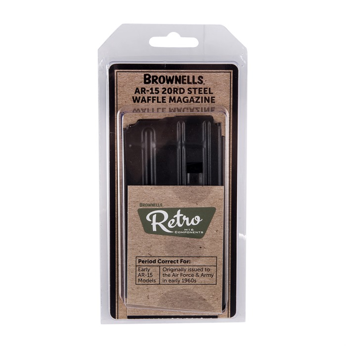 The Brownells Retro Waffle steel 20-round M16 magazine is a close replica of the original military M16 magazines issued in the late 1950s and early ’60s. With the distinctive waffle pattern stamped into its steel (NOT aluminum!) body, just like the originals, our Waffle 20-round M16 magazine gives the final touch of period accuracy to your "retro" reproduction rifle. Most of the original USGI waffle mags were destroyed by the Department of Defense and so are extremely rare and hard to come by - and the few that survived are collector’s items too valuable to shoot. Our mags give you the period-correct appearance at a fraction of the cost, with 100% up-to-date and reliable innards for dependable function in ANY AR-15 - new, old, or reproduction. Magazine body & floorplate made exclusively for Brownells by Nodak Spud Floorplate & spring are from the Brownells USGI 20rd aluminum magazines Fully heat-treated (for strength) carbon steel magazine body Waffle pattern crisply stamped into the sheet metal Matte black Parkerized finish With a Brownells Retro Waffle steel 20-round M16 magazine, you give your retro AR-15 build that vintage military look. The waffle texture gives any AR-15 shooter extra "purchase" to aid in fast mag changes in non-retro rifles, too.