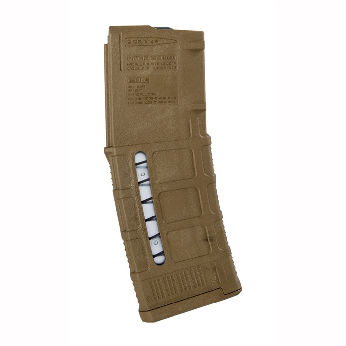 The polymer magazine that revolutionized magazine technology for the AR-15/M16/M4 platform just got even better. The third-generation PMAG further expands the strength, reliability, and versatility of the original PMAG. Along with all variants of the AR-15/M16/M4, the GEN M3 is fully compatible with the HK® 416 and MR556A1, M27 IAR, British SA-80, and even the FN® SCAR™ MK 16/16S. It’s molded from a polymer formula that delivers distinctly greater resistance to crushing and all forms of impact, with extra reinforcement in the mag catch and feed lip areas. A new-design four-way anti-tilt follower ensures even smoother feeding, even when contaminated by dust or grit. Pop-off dust cover, included, helps minimize debris intrusion and prevent damage during storage. The removable floorplate is both stronger and slimmer for easier side-by-side carry in tight mag pouches. A pen dot matrix on each side allows consistent ID marking that resists handling wear. PMAG 30 is available with a clear polymer window on each side that lets you see the load status at a glance. Windows are made from an all-new, advanced clear polymer formula that offers even more resistance to chemicals and impact than the original MagLevel PMAG.