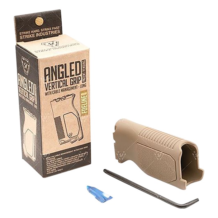 The Strike Industries Angled Vertical Grip with Cable Management is engineered like no other grip on the market. The grip angle sits on the handguard at 86 degrees. Patent pending SI cable management function enables you to organize and store excess wire from your weapon light or any other cabled accessories in multiple configurations. Instead of tucking wire anywhere you can and using cable ties or tape to hold it down, the cable management feature will offer you a place to route and/or contain loose wire inside the grip cavity. The side cuts at the top middle of the grip allow for easier pressure switch attachment. Compared to the Short version, the Long version has an added built-in stability feature when you place the L-shaped bottom onto a table edge/corner or as a barricade stop, giving you another way to get back on target faster downrange. The Short version can be mounted in either direction for your own preferred and personal setup and is low-profile form helps to minimize snags. The forward angle provides more of a natural wrist angle and increased rigidity of forearm. Designed with textured palm and finger areas with flat sides for positive handling and easier manipulation of the firearm. Made from durable and lightweight polymer compatible with M-LOK rails, the Strike Industries Angled Vertical Grip with Cable Management (Long) gives the shooter control while handling or firing the weapon, added stability (Long) with table/edge corner or as a barricade stop and an innovative way to ensure total cable management. No messy wires. 86° grip angle Built-in cable management w/ excess wire storage (patent pending) Forward angle provides more of a natural wrist angle and increased rigidity of forearm Side cuts at top of grip for pressure switch cable routing Built-in stability when L-shaped bottom is placed on a table edge/corner or as a barricade stop (Long) Low-profile design to minimize snags (Short) Can be mounted in either direction for preferred setup (Short) Textured palm and finger areas with flat sides for better weapon manipulation control Made from durable and lightweight polymer For M-LOK rails