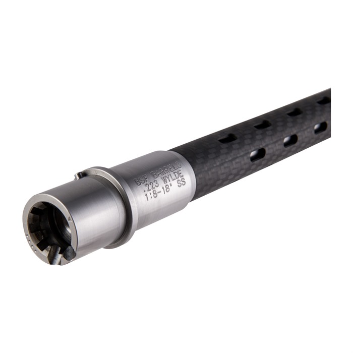 The BSF .223 Wylde Carbon Fiber AR-15 Barrels are built around a 416R stainless steel inner core wrapped in an advanced carbon fiber jacket for enhanced strength and rapid cooling. The result is the rigidity and stability of a heavy target barrel without the enormous weight penalty - your rifle is just as accurate but much easier to lug around! Since the carbon jacket on BSF .223 Wylde Carbon Fiber AR-15 Barrels contact only 5% of the inner barrel, there is an air pocket between the two that allows air to flow freely and keep the inner barrel cool. Vent holes in the carbon fiber jacket let the heat out, promoting a convection cooling process that results in a barrel that can be handled with bare hands, even after dumping two full-size 30-round mags right after each other. .223 Wylde chamber is optimized to give excellent performance with both civilian .223 Rem and military 5.56 NATO ammo 1"-8 rifling stabilizes a wide range of bullet weights .875" O.D. bull/target barrel contour Match-grade 416R stainless steel barrel is double stress relieved to further resist heat warping Three times stronger than steel, the carbon fiber wrap on BSF .223 Wylde Carbon Fiber AR-15 Barrels maintains outstanding rigidity and strength while keeping the barrel remarkably light.
