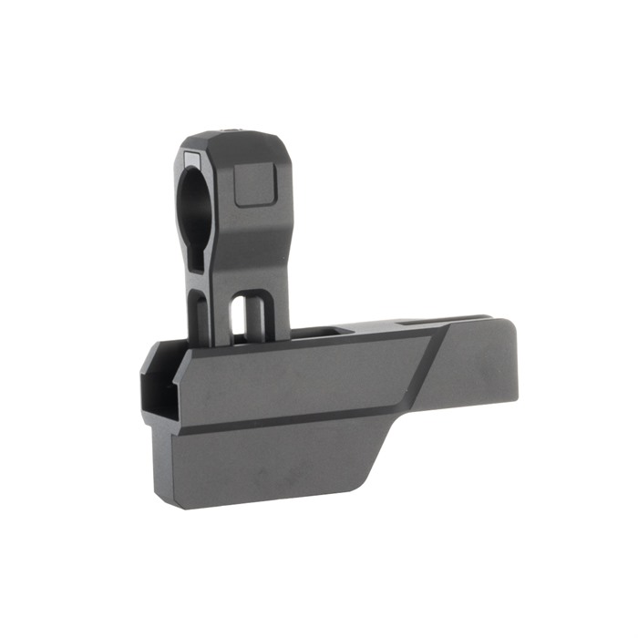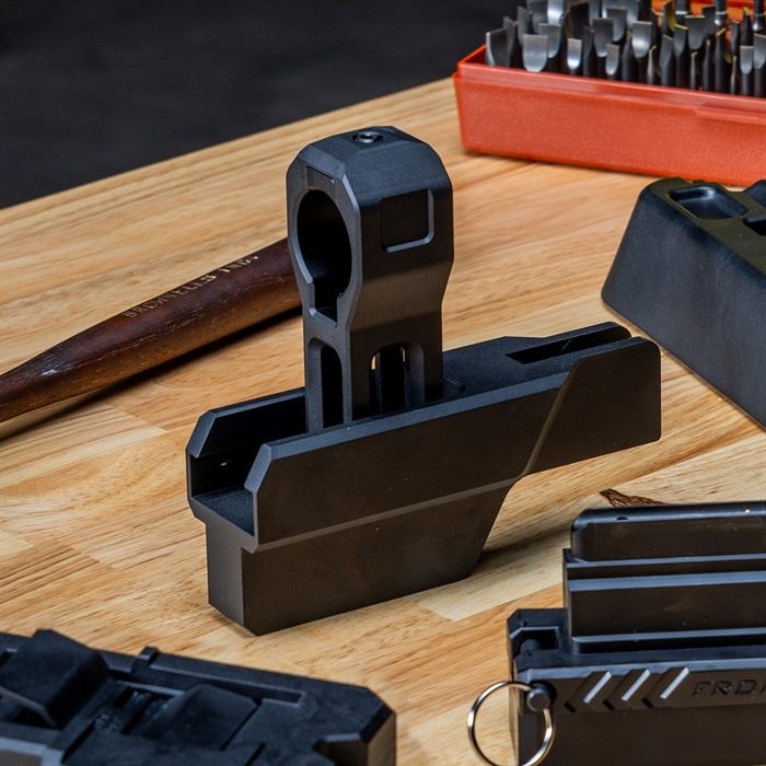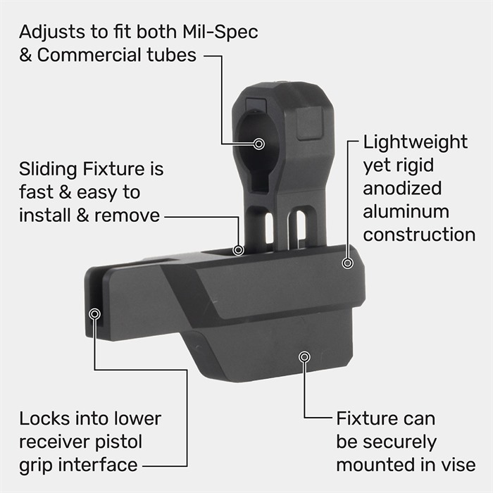 Hergestellt aus anodisiertem Aluminium, kannst du die Vorrichtung in deinem Lieblingsschraubstock, wie dem Brownells Bench Vise, platzieren und festziehen. Setze den unteren Empfänger auf die Vorrichtung, wobei der Buffer Tube durch die gleitende Röhrenstütze geführt wird. Bewege die gleitende Röhrenstütze in Richtung des Empfängers und lasse genügend Platz für einen Rüstungs-Schlüssel. Die Stütze kann einfach mit einer Einstellschraube oben auf der gleitenden Röhrenstütze für Mil-Spec und kommerzielle Rohre eingestellt werden. Sobald sie eingestellt und festgezogen ist, stelle sicher, dass dein Buffer ausgerichtet ist, und setze deine Castle Nut mit Zuversicht auf die richtigen Drehmoment-Spezifikationen.