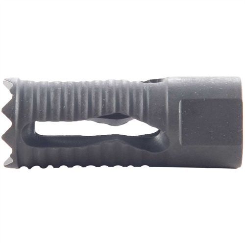 Muzzle attachments specifically designed to enhance your CQB effectiveness install on any AR-15 rifle or carbine with ½"-28 tpi muzzle threads. Aggressive, diamond-shaped teeth aid in effective less-lethal muzzle strikes during hand-to-hand combat, while wide strike face lessens danger of a penetrative wound on contact. Also serves as a stand-off device for body contact shots. Precision formed from 8620 steel, heat hardened to resist erosion by combustion gases, with a tough, parkerized finish that matches most black/dark gray rifle finishes. Muzzle Brake helps you stay on target by venting gases upward to counteract muzzle rise for fast follow-up shots; improves control and accuracy during full-auto fire. Accepts most over-the-barrel sound suppressors and actually increases their effectiveness.