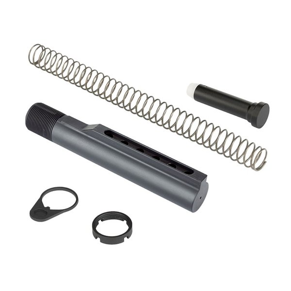 - Stellen Sie sicher, dass Sie alle Teile des Pakets haben: Buffer Tube, Rückstoßstecker, BufferFeder, Schlossmutter und Sicherungsring.