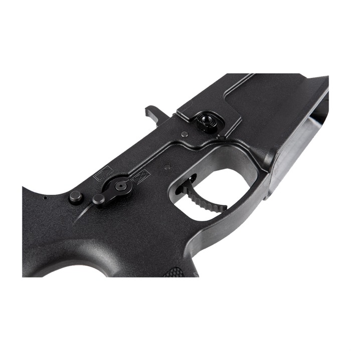 Der Hammer Pin-Bereich ist breiter für zusätzliche Haltbarkeit; Standard AR-15 Hammer Pins können weiterhin verwendet werden, obwohl der längere Hammer Pin von KE Arms für Kunden empfohlen wird, die aus ästhetischen Gründen einen flachen Pin bevorzugen. Die Feder und der Detent des Safety Selectors wurden so konzipiert, dass sie von oben geladen werden, und dann wird der Selector darüber geschoben. (Standard-Selectoren können funktionieren, aber sie zu entfernen kann besonders schwierig sein. KE Arms empfiehlt die Verwendung ihres speziellen mil-spec Selectors oder ambidextrous Selectors, um die Entfernung zu erleichtern. Folge der Montageanleitung des Herstellers für weitere Anweisungen.)