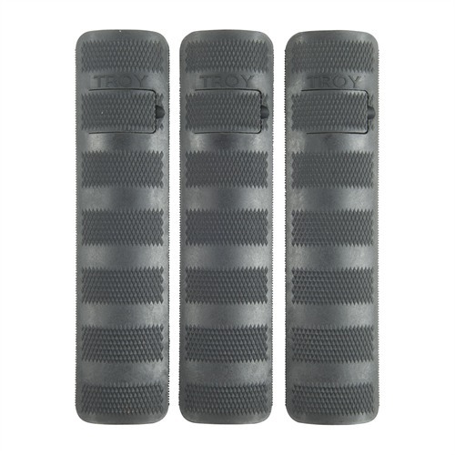 Molded polymer cover slides over any Picatinny handguard rail to provide a comfortable, secure grasping surface. Protects the hand from sharp rail edges and barrel heat during long shooting sessions. Molded-in knurled bands enhance your grip, especially when hand is wet, and match the Troy Modular Combat Grip to give your rifle a neat, unified appearance. No struggling to stretch the cover over the rail: simply pop up the retaining clip, slide on rail, and close the positive-locking clip to keep the cover firmly in place. Sold in 3-paks.
