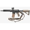 Filling the same mission requirement as the standard MS3 Sling, the MS3 Single QD can quickly switch between one-point and two-point configuration. The MS3 Single QD maintains material construction and specifications identical to that of the standard MS3, but features a heavy-duty push-button QD Sling Swivel for the one-point (rear) weapon attachment rather than the Magpul Paraclip™. This modification allows compatibility with QD sling cups commonly found on lower receivers, receiver end plates, and buttstocks. The MS3 Single QD GEN2 incorporates a new low profile quick-adjust Slider which minimizes bulk and allows for secure, yet effortless, sling adjustment. Webbing length has also been increased for a comfortable fit with all body types and armor configurations. Made in USA and 100% Berry Amendment compliant. NSN: MAG515-COY 1005-01-657-7616 FEATURES THE MS1® SLIDER Rapidly adjustable for length (shorter or longer) with new MS1 Slider Low-profile adjustment Slider for adding or removing sling tension in two-point mode with a single-hand MULTIPLE CONFIGURATIONS Designed for easy rapid convertability between one-point and two-point mode Heavy-duty push-button Quick Disconnect sling swivel for one-point attachment Paraclip shackle allows for fast transition between one-point and two-point configuration Cross-Bolt Lock Bar in the Paraclip allows the user to optionally lock its lever closed for extra security MAGPUL POLYMER AND INDESTRUCTIBLE HARDWARE Lightweight heavy-duty reinforced polymer hardware Steel Paraclip lever is case hardened and finished with a QPQ salt bath nitride process for extreme resistance to wear and corrosion SNAG-FREE, HIGH DURABILITY WEBBING Custom 1.25 inch wide nylon webbing material is strong and wear resistant while remaining anti-chaff for user comfort No tails, loops, or other potential snag hazards Colored webbing has Near Infrared (NIR) treatment to reduce IR signature SPECS Length, Overall Nominal: 48-60 in. ± 5 in. adjustment Slider Adjustment Range: 10 in. Width, Webbing: 1.25" SLING MOUNTING REAR - Works with the Magpul ASAP® for optimal shoulder transitioning in one-point mode as well as with other end plates, receivers, and buttstocks that have a QD sling socket FRONT - Compatible with the Magpul RSA®, M-LOK® Paraclip™ Sling Mount, MSA®, and shotgun Forward Sling Mounts, as well as many snap-hook style sling loops* and standard or QD sling swivels for use in two-point mode * Snap-hook style sling loops with an inner diameter of at least 3/8" are required, but 9/16" and larger will provide full range of motion of the Paraclip
