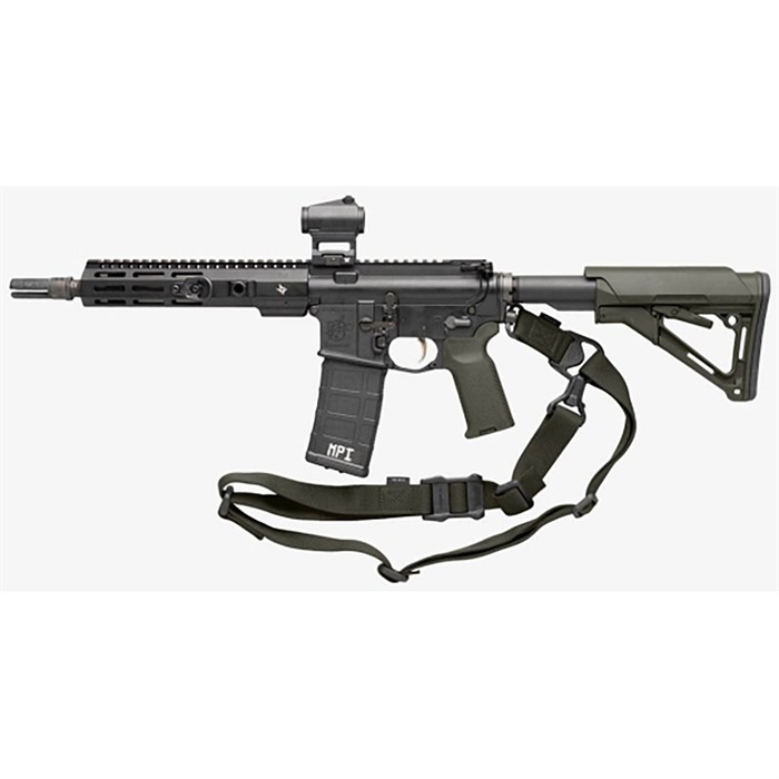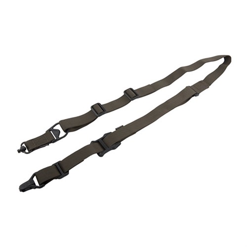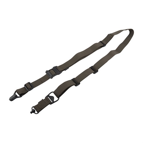 Filling the same mission requirement as the standard MS3 Sling, the MS3 Single QD can quickly switch between one-point and two-point configuration. The MS3 Single QD maintains material construction and specifications identical to that of the standard MS3, but features a heavy-duty push-button QD Sling Swivel for the one-point (rear) weapon attachment rather than the Magpul Paraclip™. This modification allows compatibility with QD sling cups commonly found on lower receivers, receiver end plates, and buttstocks. The MS3 Single QD GEN2 incorporates a new low profile quick-adjust Slider which minimizes bulk and allows for secure, yet effortless, sling adjustment. Webbing length has also been increased for a comfortable fit with all body types and armor configurations. Made in USA and 100% Berry Amendment compliant. NSN: MAG515-COY 1005-01-657-7616 FEATURES THE MS1® SLIDER Rapidly adjustable for length (shorter or longer) with new MS1 Slider Low-profile adjustment Slider for adding or removing sling tension in two-point mode with a single-hand MULTIPLE CONFIGURATIONS Designed for easy rapid convertability between one-point and two-point mode Heavy-duty push-button Quick Disconnect sling swivel for one-point attachment Paraclip shackle allows for fast transition between one-point and two-point configuration Cross-Bolt Lock Bar in the Paraclip allows the user to optionally lock its lever closed for extra security MAGPUL POLYMER AND INDESTRUCTIBLE HARDWARE Lightweight heavy-duty reinforced polymer hardware Steel Paraclip lever is case hardened and finished with a QPQ salt bath nitride process for extreme resistance to wear and corrosion SNAG-FREE, HIGH DURABILITY WEBBING Custom 1.25 inch wide nylon webbing material is strong and wear resistant while remaining anti-chaff for user comfort No tails, loops, or other potential snag hazards Colored webbing has Near Infrared (NIR) treatment to reduce IR signature SPECS Length, Overall Nominal: 48-60 in. ± 5 in. adjustment Slider Adjustment Range: 10 in. Width, Webbing: 1.25" SLING MOUNTING REAR - Works with the Magpul ASAP® for optimal shoulder transitioning in one-point mode as well as with other end plates, receivers, and buttstocks that have a QD sling socket FRONT - Compatible with the Magpul RSA®, M-LOK® Paraclip™ Sling Mount, MSA®, and shotgun Forward Sling Mounts, as well as many snap-hook style sling loops* and standard or QD sling swivels for use in two-point mode * Snap-hook style sling loops with an inner diameter of at least 3/8" are required, but 9/16" and larger will provide full range of motion of the Paraclip