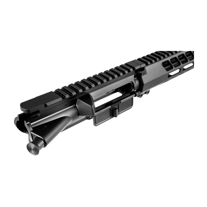Manufactured in the US with the highest quality components, the BRN-15 Upper Receiver Groups are great starts for your next build. Pick your preferred bolt carrier group and charging handle to complete. The BRN-15 Upper Receiver Groups feature a 5.56x45mm NATO chambered, nitride finished barrel, available in several popular lengths. Models are available in a Government, medium profile barrel, with the 16 inch also available in a lightweight contour. Barrels feature a gas block dimple, that the rear gas block screw securely engages. All barrels are stress releived. Unique MLOK handguard extends past the gas block, to provide as much usable real estate as possible. Anti-rotation tabs at the rear of the handguard engage the upper receiver, preventing any cant in relation to the receiver picatinny rail. Large dual screws clamp and pass through the properly torqued barrel nut to ensure the handguard will not slip forward. Large vents are placed towards the rear, to allow both the barrel and handguard to cool more rapidly. Forged Mil-Spec type upper receiver features M4 feed ramps, ejection port cover and forward assist. Forward assist pin is knurled at the front, to ease future swaps. 4150 CMV (Chrome Moly Vanadium) Barrel Chambered in 5.56x45mm NATO 1-7 Barrel Twist 1/2-28 Muzzle Threads A2 Flash Hider Forged 7075-T6 Upper Receivers Hardcoat Anodized Upper Receiver M4 Feedramps in Upper & Barrel Extension Barrels are marked "5.56 NATO 1:7 4150CMV SR" 100% American Made Please note, the 16 inch lightweight features a lock nut on the muzzle device. To remove, secure the lock nut with a wrench, turn towards the rear, and unscrew the flash hider. Does not come with bolt carrier group or charging handle. All NFA Rules Apply.