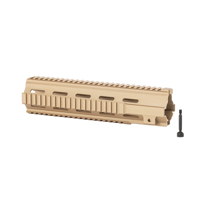 “M27” inspired Quad Rail Handguard for the BRN-4™ and HK® 416 platforms Available in 11 and 9 inch lengths, the BRN-4 M27 handguards are suitable for a variety of barrel lengths and applications. The 11 inch model is right at home with the BRN-4 M27 16 inch barrel, as it covers up the gas block and provides plenty of picatinny rail real estate on a rifle platform. The 9 inch model is right at home on carbine builds, especially a handy 10.4” model. Unique to Brownells BRN-4, these quad rail handguards are available in Flat Dark Earth. The handguard by itself on a matte black upper receiver has a distinct and unique look, and breaks up the overall profile of the firearm. Also unique on the Brownells BRN-4 quad rail handguard compared to similar handguards, is the machined in locking bolt hardware. This ensures the clamping forces are evenly spread to the body of the handguard, optimizing clamping force. You don’t have to worry about zero shifting with this setup. Indexing tab at the top interfaces with the BRN-4 upper receiver and prevents rotation.Handguard attaches directly to any Brownells BRN-4 upper receiver group, and is also compatible with HK®, 416, MR556 and MR223 platforms.