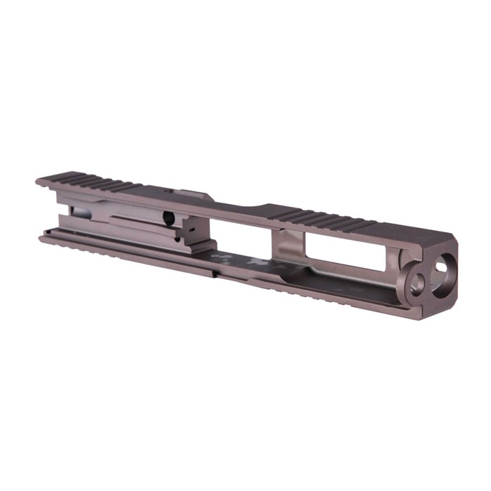 Our RMR Slide for Glock® 17 Gen3 pistols features distinctive, wraparound front cocking serrations that aid in manipulating the slide to check the chamber or clear a jam. (OK, we’ll admit it: the serrations just look cool, too.) It also comes with a pre-cut slot for easy, secure mounting of a Trijicon RMR or Holosun red dot sight. All RMR Slides also have standard Glock® factory front and rear sight dovetails for "iron" backup sights. To get proper co-witnessing with the RMR, you will need to also install suppressor-height iron sights. You can also get your Brownells RMR Slide for Glock® 17 Gen3 with a "window" cutout on top that enhances airflow to keep the barrel cool - ideal for hard-working action competition pistols. Plus, if you have an upgraded barrel with a contrasting finish or a unique exterior pattern (fluting, spirals, "flames," etc.) the window lets you show it off a bit! Each RMR Slide for Glock® starts life as a billet of 17-4 stainless steel that is machined to Glock® factory specifications inside, so it’ll fit factory frames and accept factory or aftermarket barrels and Gen3 internal parts. Slides are heat-treated to Rc 41-44 on the Rockwell C scale for added surface hardness and wear resistance. You can get your RMR slide in one of 3 finishes: a wear-resistant basic Black Nitride, or a thin, extremely tough, physical vapor deposition (PVD) coating in Bronze or Flat Dark Earth (FDE). Fits Gen3 Glock® 17 pistols & clones Machined from corrosion-resistant 17-4 stainless steel billet Trijicon RMR mounting slot Also accepts Holosun HE508T, HS507C & HS407C red dot sights Plus factory front/rear sight cuts Available with distinctive top Window cutout or traditional Solid top A Brownells RMR Slide is the ideal upgrade for your factory Glock® 17 Gen3 pistol OR the perfect "top half" for a brand-new custom gun built on a Polymer80 80% frame. Brownells Gun Tech™ Note: Channel liner required for these slides. Channel liner is a press fit and requires a tool to install. We recommend #777-100-017. Includes patented optic cut technology pioneered by ZEV Technologies. Patent No. RE47335