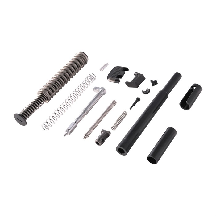 New and improved kit now comes with a billet firing pin. Contains all the parts you need to complete the innards of an aftermarket slide or refurbish a factory slide to like-new standards. All the parts in our Glock®17® Gen 3 OR Gen 5 Slide Parts Kit are aftermarket parts made to the correct dimensions for proper fit, finish, and function in a factory spec slide. The extractor is made from cast 17-4 SS. The firing pin is made from billet to improve the strength. The extractor depressor plunger and firing pin safety are machined from bar stock. Includes channel liner tool to properly install the channel liner. Kit Includes: Extractor Extractor Depressor Plunger Extractor Depressor Plunger Spring Spring -Loaded Bearing Slide Cover Plate Billet Firing Pin Spacer Sleeve Firing Pin Spring Spring Cups Firing Pin Safety Firing Pin Safety Spring Channel Liner Channel Liner Tool Guide Rod and Recoil Spring Assembly