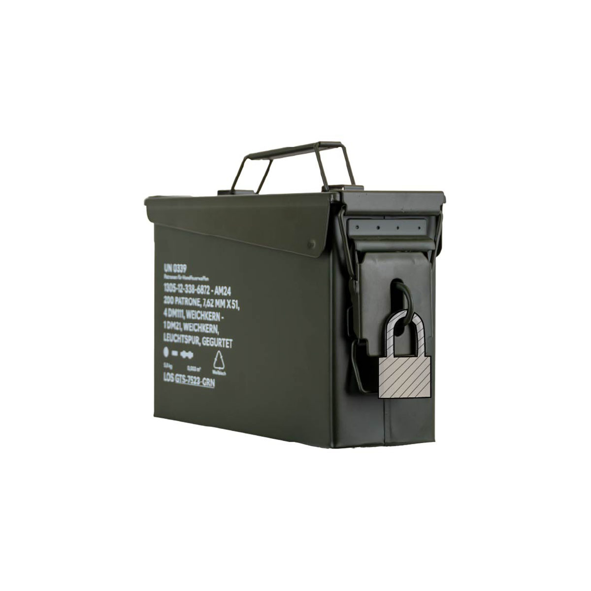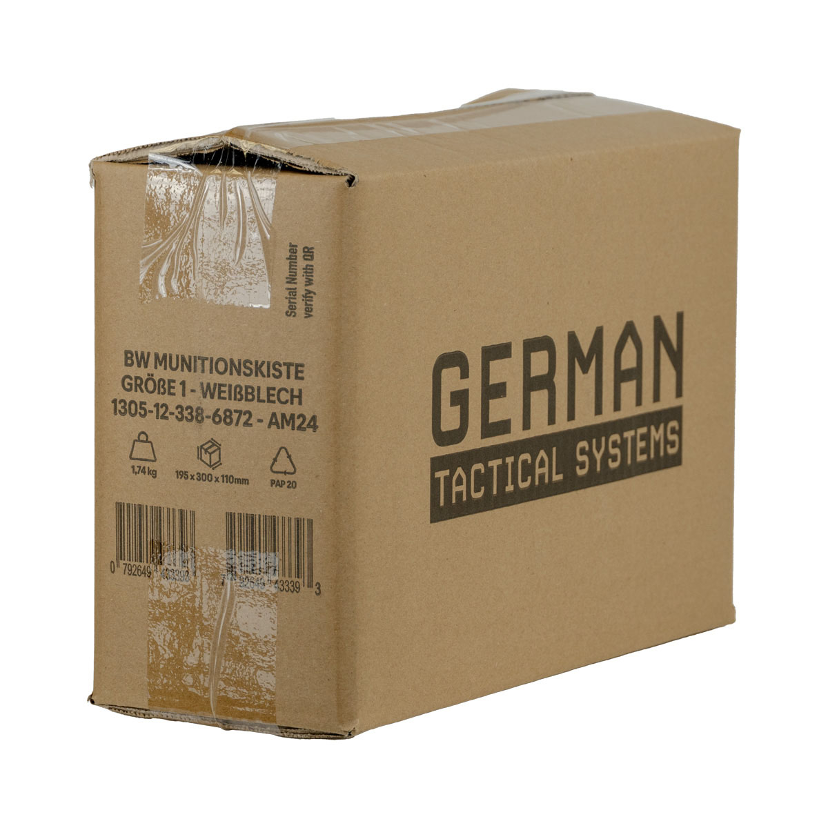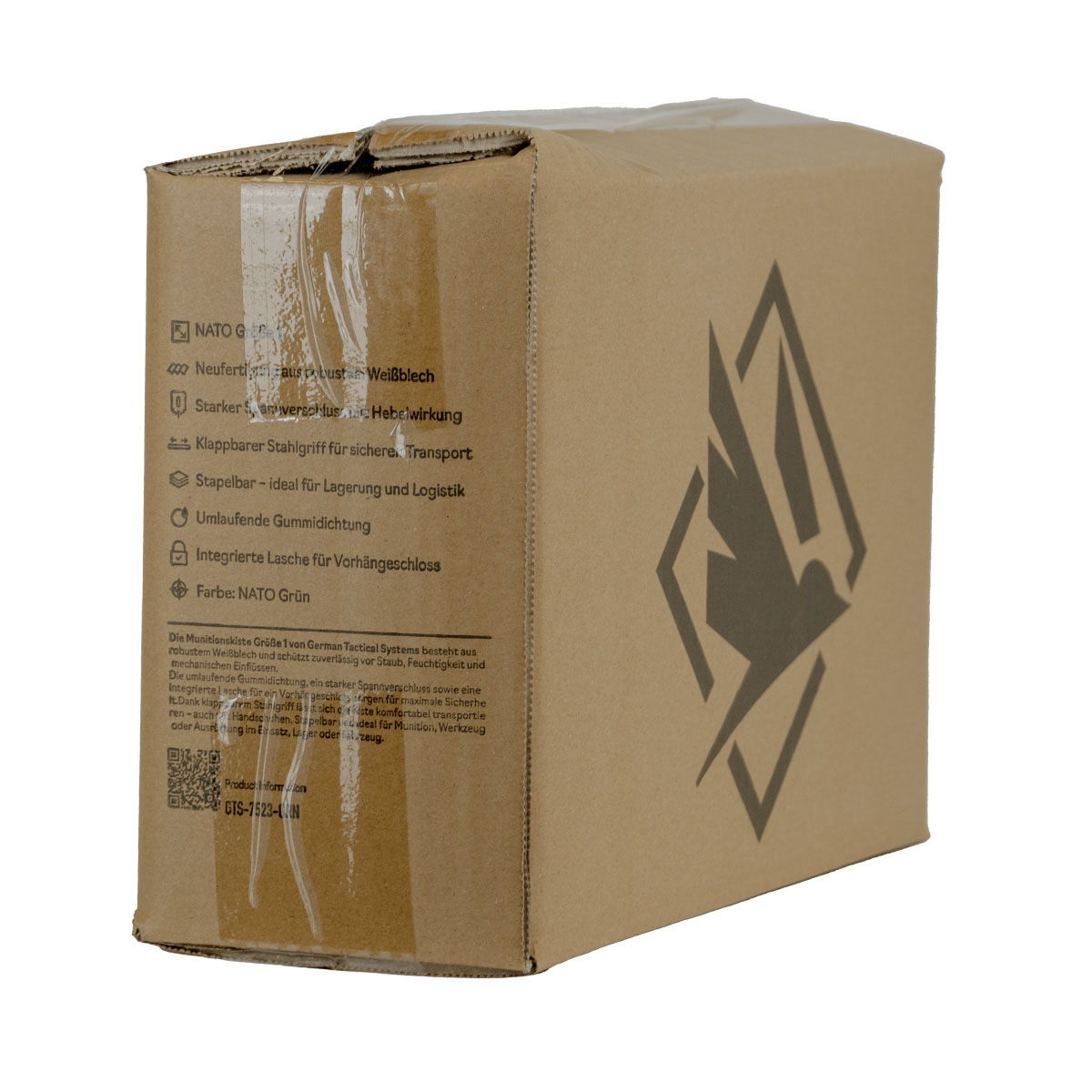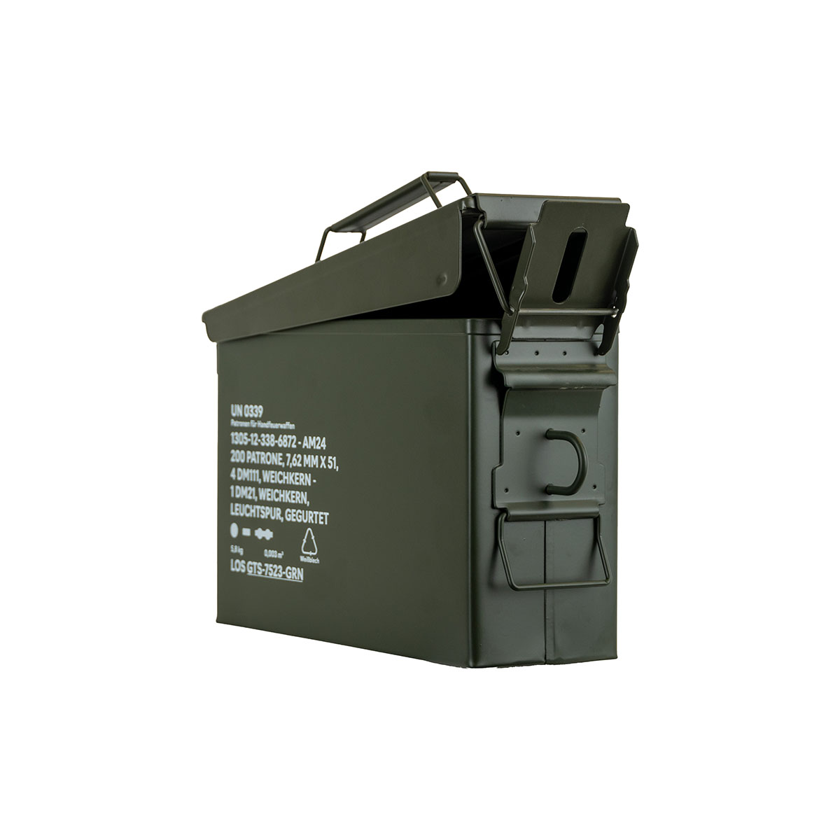 0792649433393 The German Tactical Systems BW Ammo Can (NATO Size 1 – 7.62 mm / .30 Cal) is built from rugged tinplate steel, providing dependable protection against dust, moisture, and impacts. Designed for demanding use in the field, during transport, or in storage, it keeps your ammunition and gear secure in any environment. A continuous rubber gasket ensures a tight seal, while the heavy-duty lever-lock latch keeps the lid firmly closed. For extra security, the integrated padlock tab allows you to lock the contents. The foldable steel carry handle makes transport comfortable, even with gloves, and the stackable design is ideal for organized storage and logistics. Key Features: NATO Size 1 (7.62 mm / .30 Cal) – new production from robust tinplate steel Strong lever-lock latch for secure closure Continuous rubber gasket for dust and moisture protection Foldable steel handle for safe, comfortable carrying Integrated padlock tab for added security (lock not included) Stackable design – ideal for storage and transport Color: NATO Green Perfect for storing ammunition, tools, or mission-critical equipment, the GTS BW Ammo Can delivers military-grade reliability for professionals and enthusiasts alike. Pair it with the GTS Gear Dehumidifier to keep contents dry and corrosion-free for long-term storage.In 1-4 Tagen bei dir.
