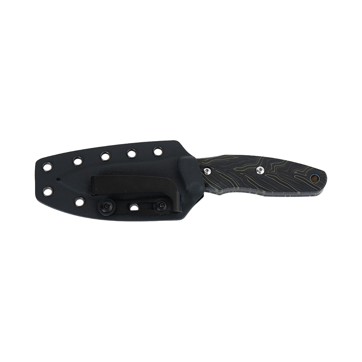 Die beiliegende Scheide kommt mit einem Gürtelclip, der sich um 90° drehen lässt, sodass du ihn vertikal oder horizontal tragen kannst. Sie ist auch Tek-Lok-kompatibel, sodass du sie ganz einfach an Gürteln, Rucksäcken oder Ausrüstung anbringen kannst, wie du es möchtest.