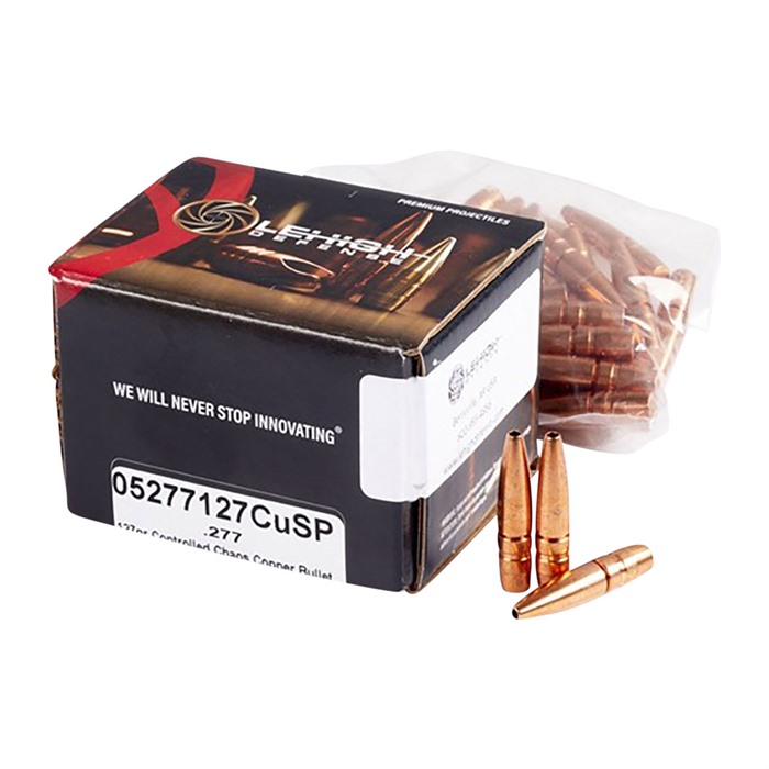 There are two philosophies when it comes to bullets. One that believes rapid expansion, moderate penetration and weight loss is best, while the other believes that moderate expansion, deep penetration and virtually no weight loss is best. Both have their virtues and applications, but why settle for one or the other when you can have both? Controlled Chaos bullets offer the best of both. Once fluid is impacted, they shed the front portion of the bullet into multiple petals that radiate outward away from the bullets initial trajectory path resulting in a massive energy spike. The bore diameter base of the bullet continues and penetrates deeply in a straight line. Both the temporary and permanent wound cavity created by this bullet separation is dramatic resulting in quick incapacitation. The solid base creates additional tissue damage and often results in full penetration of the animal. SPECIFICATIONS(112gr): Cartridge: 6.8mm SPC Best Used For: Hunting, Tactical, Self Defense Ballistic Coefficient (G1): 0.335 Box Quantity: 50 Bullet Material: Copper Bullet Caliber: .277 Bullet Length: 1.080 Minimum Impact Velocity (fps): 1500 Maximum Muzzle Velocity (fps): 5000 Bullet Technology: Controlled Chaos Bullet Weight (gr): 112.00 Velocity Sensitivity: Yes Gun Type: Rifle Lead Free Bullet: Yes Minimum Twist Rate: 1:11 Ogive Length (inches): 0.538 Sectional Density: .209 Velocity Rating: Supersonic SPECIFICATIONS(127gr): Cartridge: 270 Winchester, 270 WSM Best Used For: Hunting, Tactical, Self Defense Ballistic Coefficient (G1): 0.429 Box Quantity: 50 Bullet Material: Copper Bullet Caliber: .277 Bullet Length: 1.305 Minimum Impact Velocity (fps): 1500 Maximum Muzzle Velocity (fps): 5000 Bullet Technology: Controlled Chaos Bullet Weight (gr): 127.00 Velocity Sensitivity: Yes Gun Type: Rifle Lead Free Bullet: Yes Minimum Twist Rate: 1:9 Ogive Length (inches): 0.74 Sectional Density: .236 Velocity Rating: Supersonic