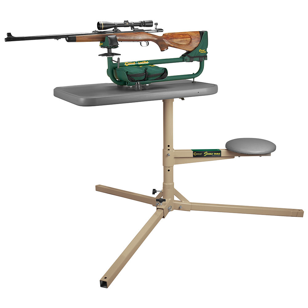 661120525523 Der Caldwell® Stable Table® ist speziell entwickelt worden, um die beste preiswerte Schießbank auf dem Markt zu sein. Das Dreibein-Design ist stabiler und hat weniger Gelenke als klappbare Bänke und eignet sich für eine Vielzahl von Schießbedingungen und Disziplinen. Ein Bolzen an der Basis ermöglicht die Positionsanpassung eines einzelnen Beins, sodass die Tischplatte parallel zum Horizont ausgerichtet werden kann. Der zentrale Schaft, der Sitz und die Tischplatte können sich als eine Einheit um eine Mittelachse drehen, während die Tischplatte parallel zum Horizont bleibt. Dies ermöglicht es dir, aus einer einzigen Einrichtung Schüsse aus jedem Winkel abzugeben – ideal für das Varmint-Jagen. Die Bank kann bei Bedarf leicht in einer einzigen Schießposition fixiert werden. Die Tischplatte besteht aus geformtem Kunststoff mit einem stabilen Metalluntergestell. Die Abmessungen der Tischplatte betragen 34” x 23” und sie enthält Löcher, die als Griffe für den einfachen Transport oder als Halter für die beiliegenden Reinigungszangen fungieren, sowie eine Umrandungsleiste, die verhindert, dass Munition von der Tischplatte rollt. Der gesamte Rahmen besteht aus geschweißtem Stahl. Der gepolsterte Sitz lässt sich von 16” bis 22” verstellen und dreht sich synchron mit der Tischplatte. Praktische Reinigungszangen sind enthalten, die in der Tischplatte einrasten und eine Waffe sicher zum Reinigen halten. Die Schießbank zerlegt sich in sieben Teile und wiegt insgesamt 60 Pfund, wenn sie montiert ist.Nachbestellt, Lieferzeit ca. 4-12 Wochen aus dem Lager Europa.
