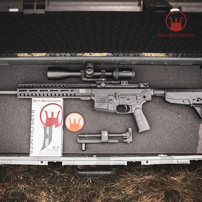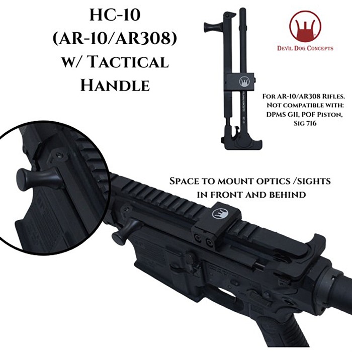 DEVIL DOG CONCEPTS AR-308 HC-10 SIDE CHARGING HANDLE W/TACTICAL PULL HANDLE HC-10: The AR-10/AR308 Side Charging Handle – with Folding Handle Sick of the charging handle on your AR-10/AR308 Rifle! Turn your 308 AR style rifle in to a Side Charger? Turn your rifle in to a Side Charger without having to rebuild or modify it. Simply swap out the charging handle and install the Hard Charger. Takes a couple minutes and you are up and running! FEATURES Devil Dog Concepts’ Side Charging Handle System = Ergonomically Beneficial Multiple Ways to Charge Interchangeable from Rifle to Rifle Non Reciprocating Removes Stress on Roll Pin Reduces Torque on Charging Handle Field Strippable Gross Motor Skills Plenty of Room for Mounting Optics and Sights The HC-10 Side Charging Handle for 308 type AR platforms is designed to adjust to different thicknesses of the varying types of these rifles. The HC-10 is also designed to adjust for different picatinny rail heights and picatinny slot orientations. *Does not work on POF Piston Driven rifles or DPMS G2 and similar. SPECS For AR-308 Rifles Not for Sig 716, DPMS GII, or POF Piston Made from 7075 Aluminum Anodized Black, and Steel Weighs 7oz 5 year manufacturer warranty. U.S. Patent No. 9,746,263 U.S. Trademark Reg. No. 5,354,510