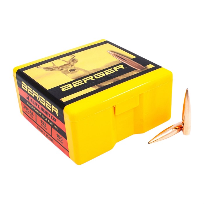 The .25 Caliber, 133 Grain Elite Hunter offers a heavy-for-caliber bullet solution for .25 caliber hunting platforms that maximizes both energy and terminal performance. Elite Hunters utilize Berger’s industry leading hybrid ogive design, that blends tangent and secant designs to optimize efficiency, reduce wind-drift, and minimize sensitivity to seating depth. Their sleek profile features an ultra-high ballistic coefficient (BC) and increased sectional density, delivering the highest energy upon impact. Elite Hunters are easy to load and shoot, and provide unmatched accuracy and performance. The new 25 Caliber, 133 Grain brings unmatched external performance to the 25 caliber realm that has been historically limited by lower weight projectiles. Paired with efficient and low recoil cartridges, this bullet produces ultra-flat trajectories, while delivering fantastic terminal performance and energy transfer upon impact.