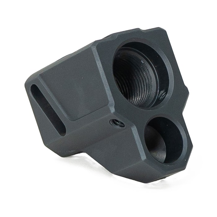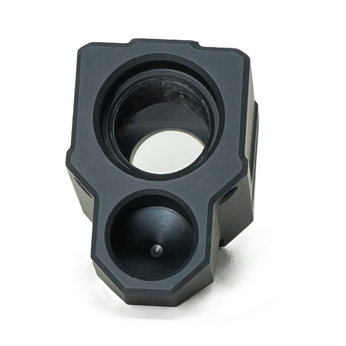 Hergestellt aus 6061 Aluminium mit einer schwarzen anodisierten Oberfläche, verfügt der Faxon Pistol Compensator über ein einzigartig gewinkeltes Frontport-Design mit einem einzelnen Kammer. Dies ermöglicht es, die Konsistenz zu verbessern, während der Mündungshub und der Rückstoß reduziert werden.
