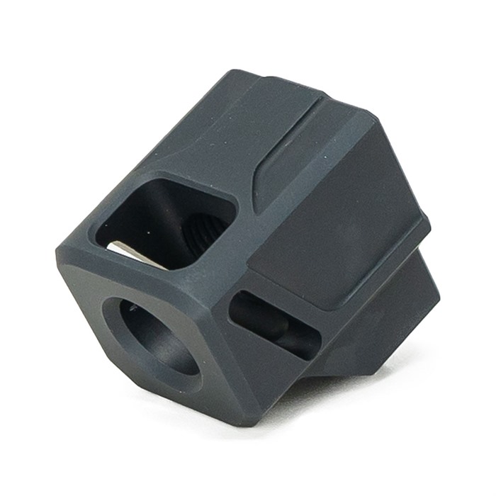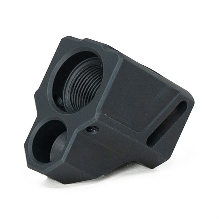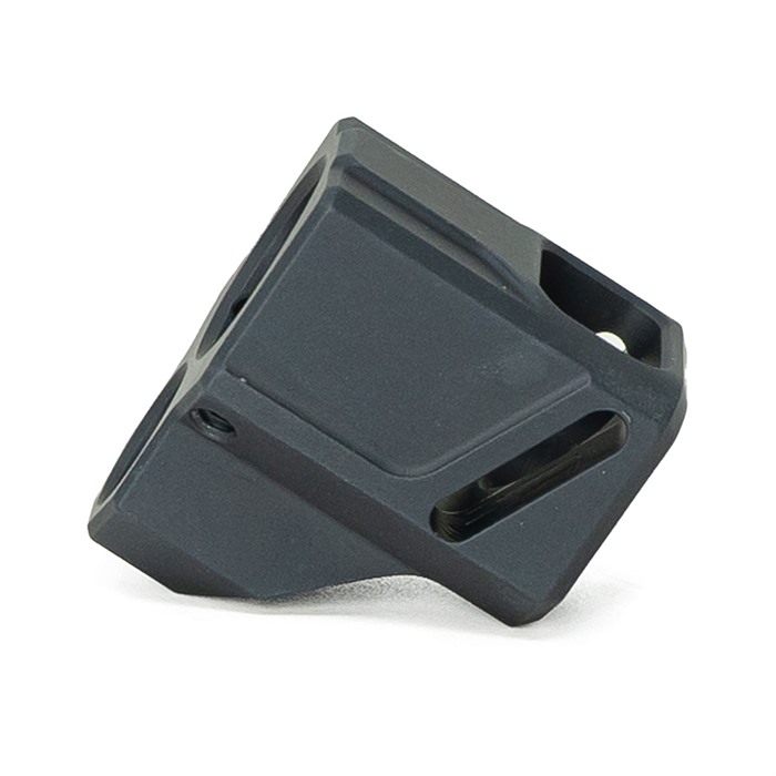 Die gewinkelten Ports lassen das Gas nach oben ablenken, anstatt nur seitlich, wodurch die Auf- und Abbewegung der Mündung verringert und die Zuverlässigkeit verbessert wird. Der Laufvorsprung ist so konzipiert, dass er bündig mit dem Schlitten abschließt und wurde für Faxon-Markenläufe optimiert. Bei allen anderen Läufen sollte der Lauf nicht mehr als .600” herausragen, um eine bündige Passform zu gewährleisten.