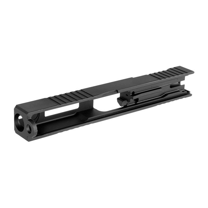 Our RMR Slide for Glock® 17 Gen3 pistols features distinctive, wraparound front cocking serrations that aid in manipulating the slide to check the chamber or clear a jam. (OK, we’ll admit it: the serrations just look cool, too.) It also comes with a pre-cut slot for easy, secure mounting of a Trijicon RMR or Holosun red dot sight. All RMR Slides also have standard Glock® factory front and rear sight dovetails for "iron" backup sights. To get proper co-witnessing with the RMR, you will need to also install suppressor-height iron sights. You can also get your Brownells RMR Slide for Glock® 17 Gen3 with a "window" cutout on top that enhances airflow to keep the barrel cool - ideal for hard-working action competition pistols. Plus, if you have an upgraded barrel with a contrasting finish or a unique exterior pattern (fluting, spirals, "flames," etc.) the window lets you show it off a bit! Each RMR Slide for Glock® starts life as a billet of 17-4 stainless steel that is machined to Glock® factory specifications inside, so it’ll fit factory frames and accept factory or aftermarket barrels and Gen3 internal parts. Slides are heat-treated to Rc 41-44 on the Rockwell C scale for added surface hardness and wear resistance. You can get your RMR slide in one of 3 finishes: a wear-resistant basic Black Nitride, or a thin, extremely tough, physical vapor deposition (PVD) coating in Bronze or Flat Dark Earth (FDE). Fits Gen3 Glock® 17 pistols & clones Machined from corrosion-resistant 17-4 stainless steel billet Trijicon RMR mounting slot Also accepts Holosun HE508T, HS507C & HS407C red dot sights Plus factory front/rear sight cuts Available with distinctive top Window cutout or traditional Solid top A Brownells RMR Slide is the ideal upgrade for your factory Glock® 17 Gen3 pistol OR the perfect "top half" for a brand-new custom gun built on a Polymer80 80% frame. Brownells Gun Tech™ Note: Channel liner required for these slides. Channel liner is a press fit and requires a tool to install. We recommend #777-100-017. Includes patented optic cut technology pioneered by ZEV Technologies. Patent No. RE47335