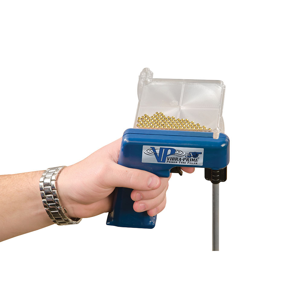 Der Vibra-Prime™ kann in wenigen Sekunden 100 Primer in eine Primer-Tube laden, dank seines einzigartigen motorisierten Agitationsmechanismus. Die gefüllten Tuben lassen sich anschließend ganz einfach in jede Modell-Progressive-Presse übertragen.