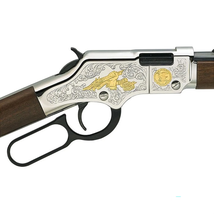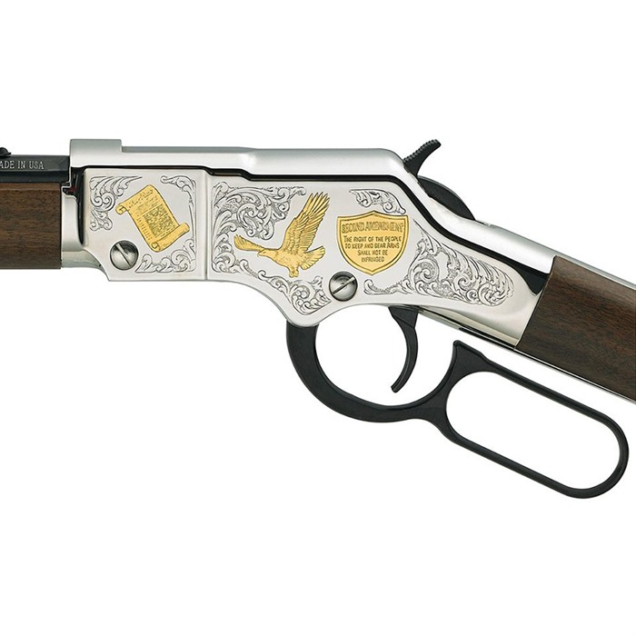 HENRY REPEATING ARMS GOLDEN BOY 2ND AMENDMENT TRIBUTE EDITION 22 LONG RIFLE LEVER ACTION RIFLE The National Rifle Association was originally chartered in the State of New York in 1871, with the goal of establishing marksmanship training for riflemen. The New York Legislature provided funding for a brand new thoroughly modern range at Creedmore, Long Island, officially opened in 1873, to support the effort. Beginning with its association with the Creedmore Range, the NRA became heavily involved in the rising sport of competitive rifle shooting both domestically and abroad, and soon organized other clubs in other states. The NRA’s instruction manual eventually evolved into the US Army’s training program, and the organization has provided instructors and training in several aspects of firearms sports and safety that include rifles, handguns and shotguns, to hundreds of thousands of new shooters of all ages for well over 100 years. In 1934, the NRA formed its Legislative Affairs Division, and became increasingly active in the politics of gun ownership with mounting pressure from more restrictive legislation in the years following, creating the Institute For Legislative Action (the NRA’s lobbying arm) in 1975. Since then, as America’s oldest civil rights organization, the NRA continues to be the leading national voice and face of millions of law-abiding citizens who peacefully exercise their Second Amendment rights, coast to coast. In 2016 Henry built a limited run of 2,000-unit Golden Boy NRA Second Amendment Tribute Edition rimfire lever actions for Friends Of The NRA to salute the organization’s contributions during its 145 years of service in our behalf, and we felt so strongly about the matter that we decided to bring it back in 2017 as a general-issue cataloged model for everybody who wants one. The NRA Second Amendment Tribute is based on their proven Golden Boy platform, with 20” octagon blued barrel and American walnut furniture, in .22 S/L/LR caliber, wearing our standard adjustable semi-buck and brass bead sights, and featuring a .22 LR magazine capacity of 16 rounds. For display, or for affirming your right to own and shoot this tribute to the National Rifle Association and the Second Amendment it so strongly defends, another Henry lever action you can be as satisfied to own as we are to make. SPECIFICATIONS: Caliber: 22 L/LR/S Capacity: 16 Rounds Barrel Length: 20" Barrel Type: Octagon Blued Steel Rate of Twist: 1:16 Overall Length: 38.5" Weight: 6.75 lbs. Receiver Finish: Nickel Plated Rear Sight: Fully Adj. Semi-Buckhorn w/ Diamond Insert Front Sight: Brass Bead Scopeability: Drilled and Tapped Scope Mount Type: GB-CSM Stock Material: American Walnut Buttplate/Pad: Nickel Plated Length of Pull: 14" Safety: 1/4 Cock Best Uses: Target/Hunting/Collector Embellishments/Extras: Receiver Engraving with 24K Gold Plating. Gold Eagle, 2nd Amendment and Scroll