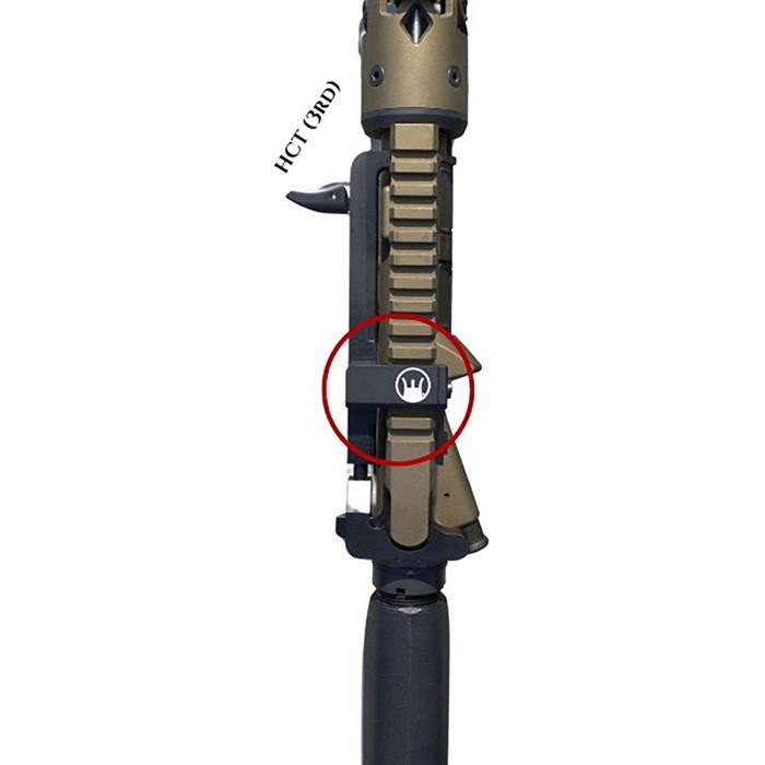 Der HCT (Hard Charger® Tactical) wird an der 3. Picatinny-Schiene montiert und ist für Standard, Forged, Mil-Spec Typ obere Receiver ausgelegt. Dieses Design wird zwischen einem Backup Sight und einem nach vorne montierten Optik angebracht. Bitte beachte, dass es nicht für Billet-Gewehre, einschließlich Aero M4E1, geeignet ist.