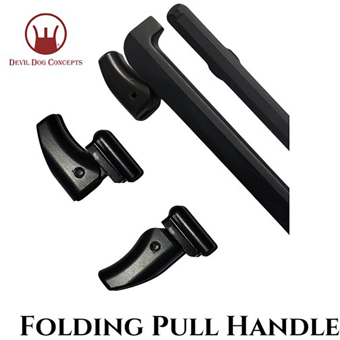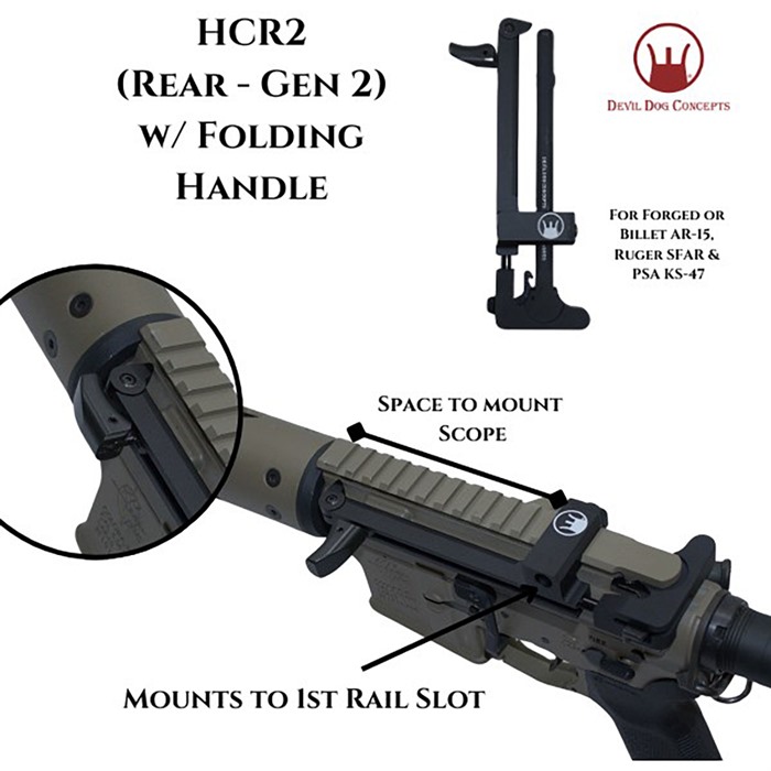 DEVIL DOG CONCEPTS HCR2 G2 HARD CHARGER REAR SIDE CHARGING HANDLE W/FOLDING HANDLE FOR AR-15 HCR2 (Hard Charger® Rear – Gen 2) with Folding Handle: for AR-15 Forged/Billet, SFAR & KS-47 No longer do you have to rebuild your upper receiver or buy a new rifle to have the side charging capability!! Turn your rifle in to a Side Charger without having to rebuild or modify it. Simply swap out the charging handle and install the Hard Charger. Takes a minute or less and you are up and running! FEATURES Devil Dog Concepts’ Side Charging Handle System = Ergonomically Beneficial Multiple Ways to Charge Interchangeable from Rifle to Rifle Non Reciprocating Removes Stress on Roll Pin Reduces Torque on Charging Handle Field Strippable – Gross Motor Skills Plenty of Room for Mounting Optics and Sights The HCR2 (Hard Charger® Rear Gen 2) Mounts to the 1st Picatinny Rail. This new model is designed to work on Standard, Forged, Mil-Spec Type Upper Receivers & Billet Rifles. Not designed for Aero M4E1 Will also work on Ruger SFAR & PSA KS-47 This design mounts to the first slot allowing for scope base mount in front. The adjustable tip allows for mounting on varying width Billet Receivers as well as the Ruger SFAR and PSA KS-47. SPECS For Forged & Billet AR-15s, and also Ruger SFAR & PSA KS-47 Made from 7075 Aluminum Anodized Black, and Steel Weighs 6oz