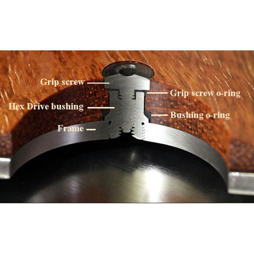 Die Hex Drive Bushings können mit einem optionalen O-Ring ausgestattet werden, der dafür sorgt, dass die Griffe fest an ihrem Platz bleiben und Stöße während des Schusses minimiert werden. Die Verwendung von O-Ringen reduziert das Abnutzen des Rahmens durch G10 und andere abrasive Griffe, schützt zerbrechliche und teure Griffe wie Elfenbein und Mammutstoßzähne und minimiert das Lösen der Bushings, das durch schwere Griffmaterialien wie G10, Kohlefaser und Aluminium verursacht wird.