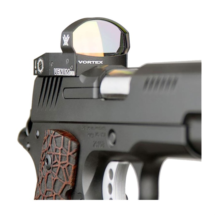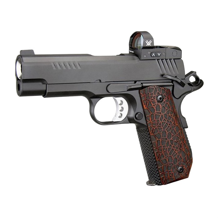 All of the features you love about the KC9, now equipped with a red dot sight! The 6 MOA dot promotes rapid target acquisition, while providing a precise point of aim. Optimized for the 9mm caliber, the KC9 retains 100% 1911 controls and handling characteristics, but re-designed to take advantage of modern improvements such as the external extractor, easy-to-change front sight, bull barrel, and a flat wire recoil spring system. The re-engineered slide has been shortened to 4"", thinned substantially for weight reduction, and includes a unique 7-top custom cut, with special front and rear serrations. A recessed slide stop completes the package. • 4"" slide, thinned substantially for weight reduction. Single stack Bobtail® frame. Exclusive Snakeskin treatment on forestrap and Bobtail® housing. 7-top custom cut slide with special front and rear serrations. External extractor. Easy to change black front sight. 6 MOA Vortex Venom® red dot sight. Bull barrel. Guide rod with flat wire recoil spring system Custom options included: recessed slide stop, flush barrel with recessed crown.