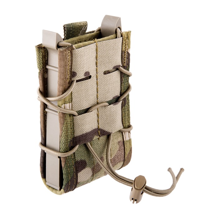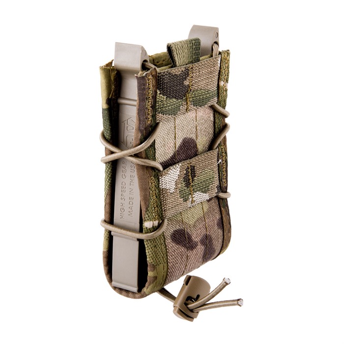 High Speed Gear’s TACO Rifle Molle mounted magazine carrier uses injection molded polymer sides, Cordura™ front and back, and shock cord lacing to lock just about any rifle magazine into place. USGI, HK, PMAG, ARC, FAL, AK 30/ 40, LR20 and M14 magazines are all held securely and deployed easily and silently on demand. The TACO® Rifle magazine carrier even works for certain radios, flash bangs and smoke grenades and provides this versatility while taking up only 3” horizontal inches on your mounting platform. The pouch maintains a positive, adjustable grip on its contents without additional securing systems. However, if additional retention is desired webbing tabs are sewn in on the top for use of "over the top" bungee retainers and loop Velcro is sewn on the interior if the users wishes to use adhesive hook on the magazine.