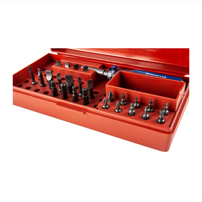 BROWNELLS STANDARD MAGNA-TIP SETS The Brownells Standard Magna-Tip® Sets are meticulously designed to meet the diverse needs of gunsmiths and firearm enthusiasts, offering a comprehensive selection of interchangeable bits and handles for precise firearm maintenance and assembly. Key Features: Comprehensive Bit Selection: Each set includes eleven bits for slotted screws, #1, #2, and #3 Phillips bits, plus ten hex bits for socket head screws, ensuring versatility across various firearm applications. True Hollow-Ground Bits: The Magna-Tip® bits feature true hollow-ground tips that transmit torque evenly and smoothly up the shank, providing complete metal-to-metal contact with the screw slot. This design allows maximum power to be exerted without damaging the screw. Durable Construction: Manufactured from high-quality materials, these bits are built to withstand rigorous use, ensuring long-lasting performance. Ergonomic Handle Design: The handle is made from shockproof plastic with grooved flutes for a positive grip, allowing for comfortable and controlled use during firearm maintenance tasks. Shockproof plastic with grooved flutes Specifications: #1 Standard Kit Includes the Magna-Tip handle of your choice. 24 bits. 11 slotted, 3 Phillips, & 10 hex bits. Includes the box and tray for organized storage and easy access. #2 Standard Kit Includes the Magna-Tip handle of your choice. 24 bits. 11 slotted, 3 Phillips, & 10 hex bits. #3 Standard Kit Includes the Magna-Tip handle of your choice. 11 slotted bits. Included the box and tray for organized storage and easy access. Customer Insights: Our customers appreciate the Brownells Standard Magna-Tip® Sets for their versatility and precision. The comprehensive selection of bits allows Customers to tackle a wide range of firearm maintenance tasks with confidence. The true hollow-ground design ensures a secure fit in screw slots, minimizing the risk of damage during use.The durable construction and ergonomic handle design contribute to a comfortable and reliable user experience, making these sets a valuable addition to any gunsmith's toolkit. Incorporating the Brownells Standard Magna-Tip® Set into your firearm maintenance routine ensures you have the right tools to perform tasks with precision and confidence. Their specialized design and robust construction make them essential for achieving professional results in gunsmithing.